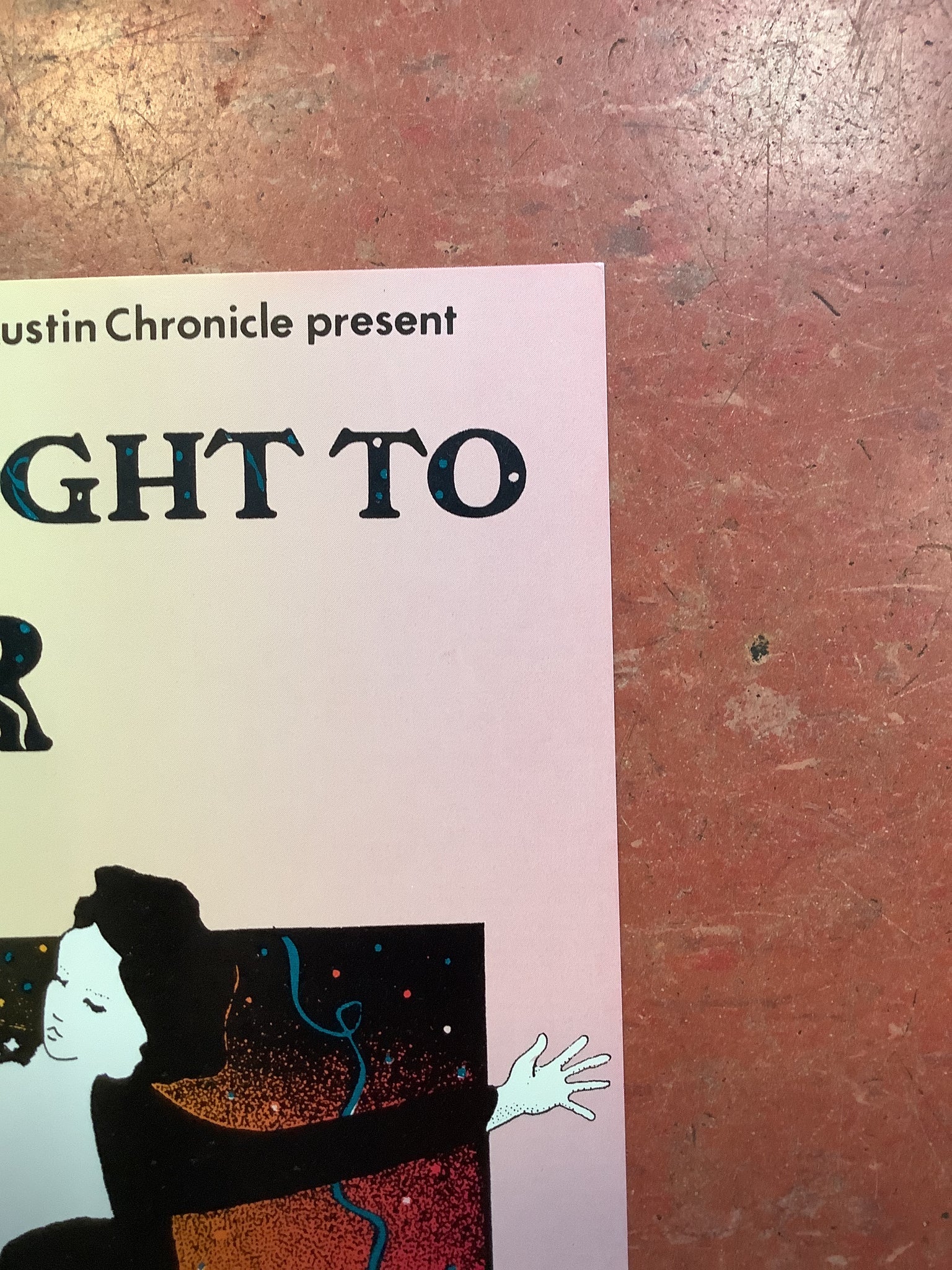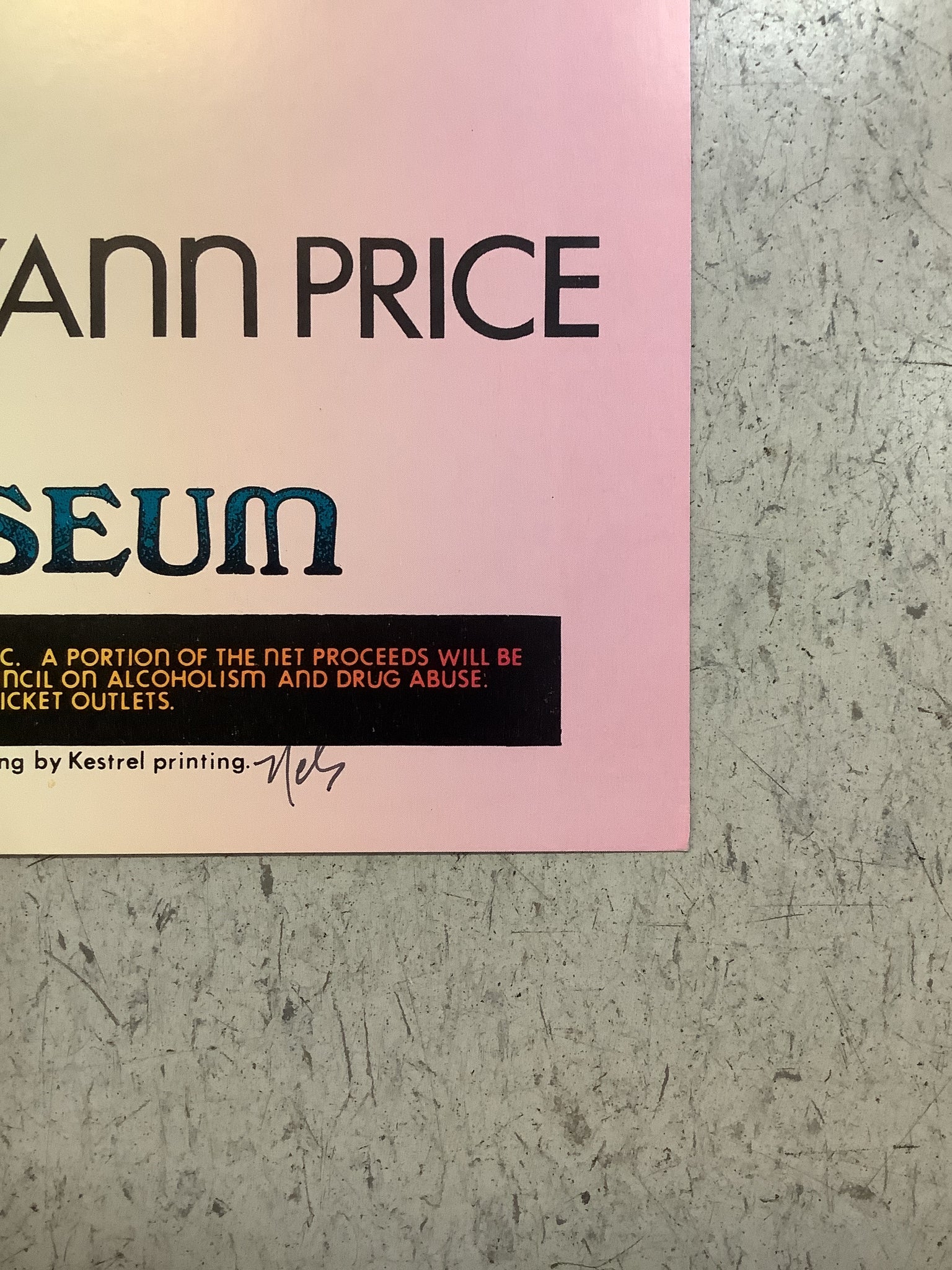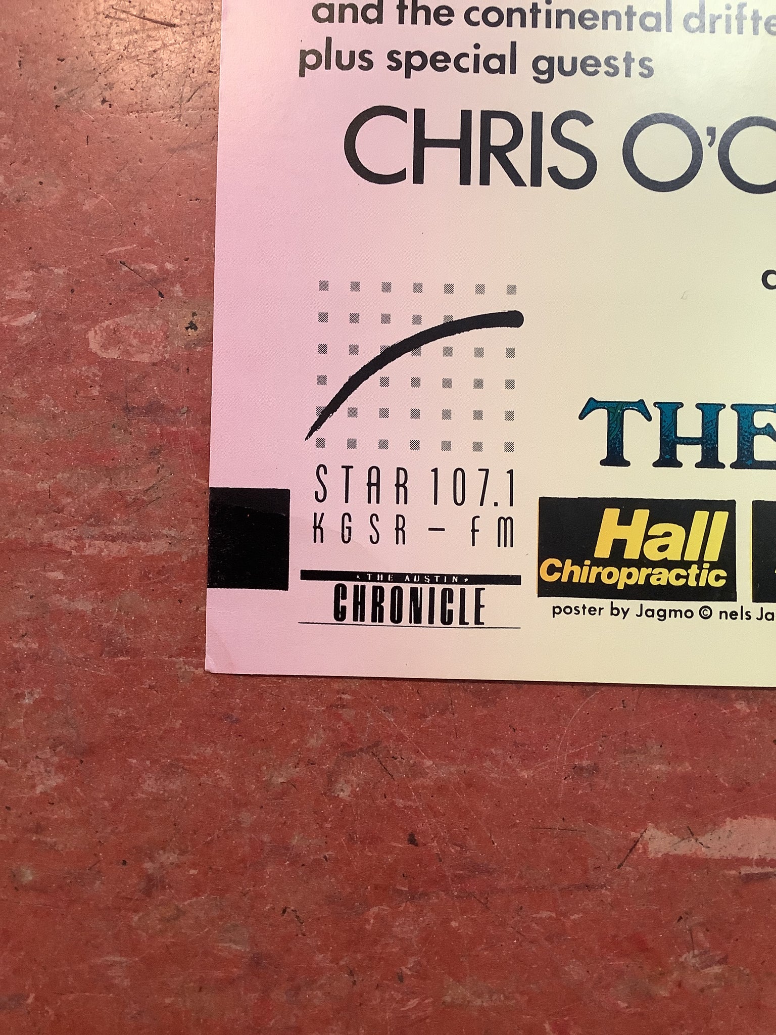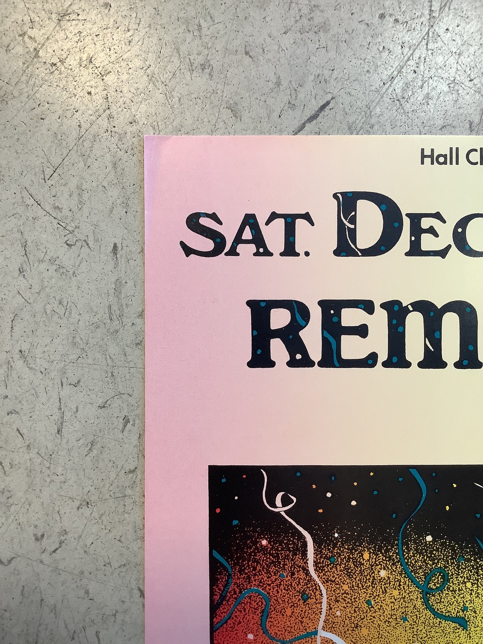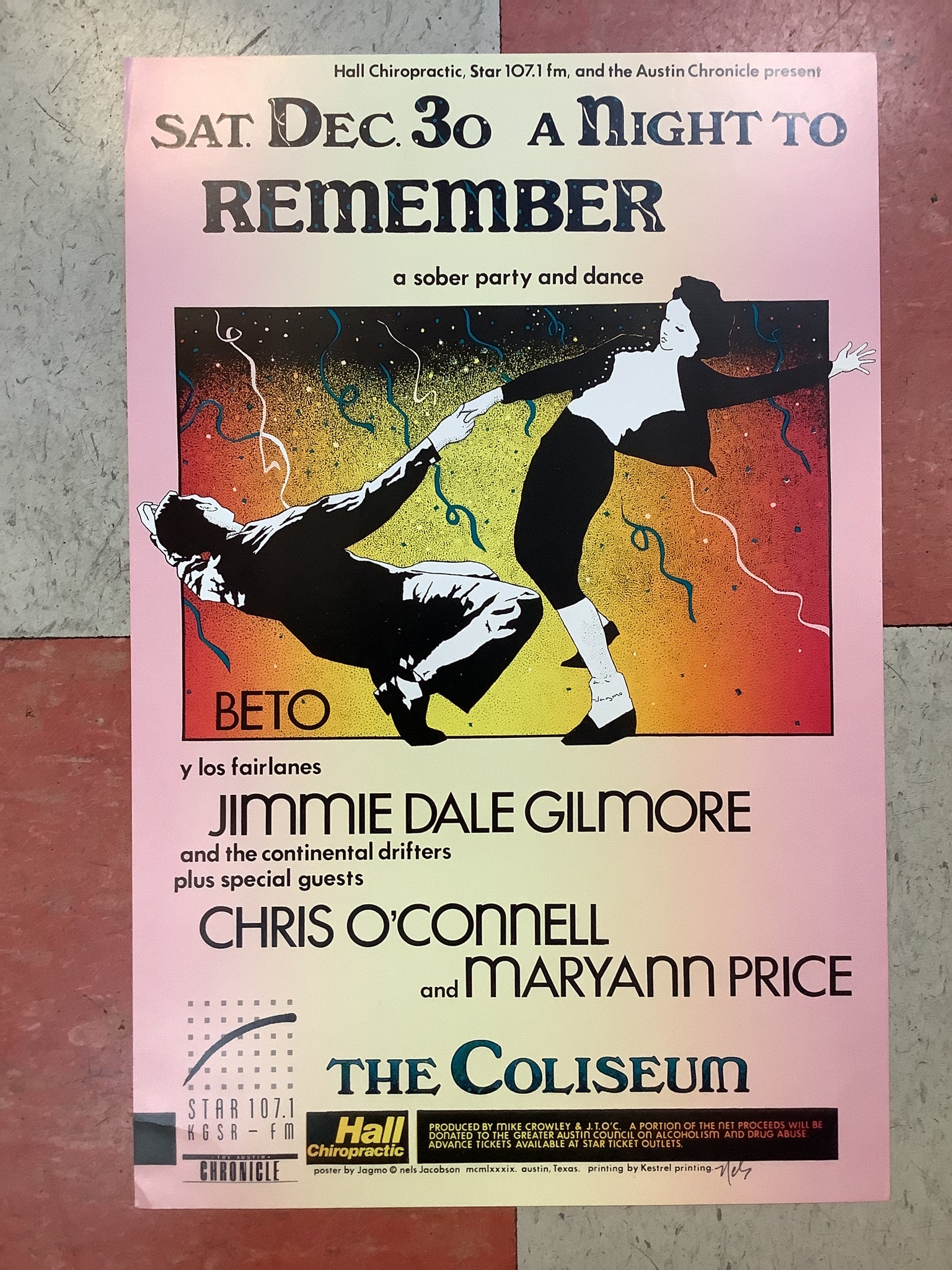 Vintage poster promoting "A Night to Remember": A Sober Party and Dance with performances by Beto Y Los Fairlanes, Jimmie Dale Gilmore and The Continental Drifters, Chris O'Connell, and Maryann Price. At The Coliseum on December 30th, 1989. Designed and hand-signed by Jagmo.