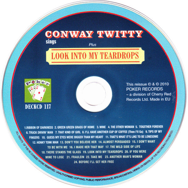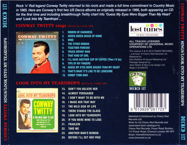 ‘Conway Twitty Sings' originally released on LP in 1966 as [r=3382791. 'Look Into My Teardrops' originally released on LP in 1966 as [r=1619051. From the disc face and rear tray insert: “This reissue ℗ & © 2010 POKER RECORDS - a division of Cherry Red Records Ltd.” “Made in EU” Track durations do not appear on this release. Standard clear jewel case release including a sixteen page booklet and a two-sided rear tray insert.