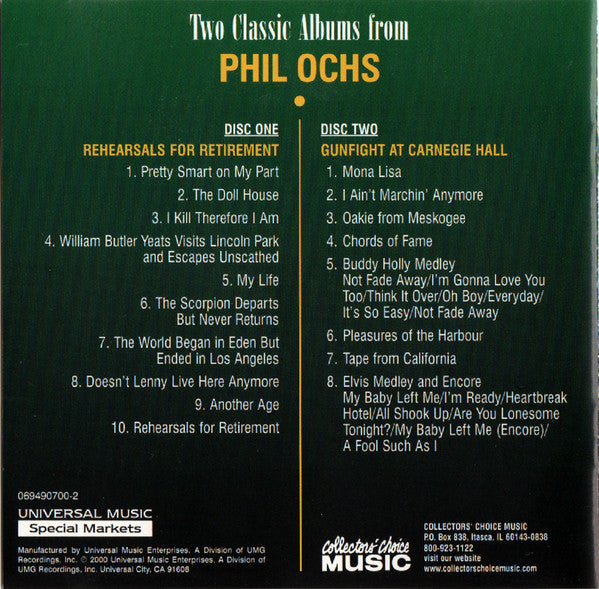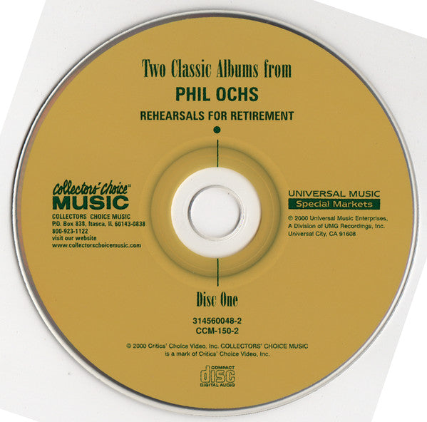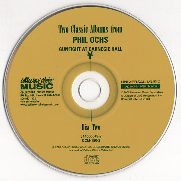 Printed in the U.S.A. With sticker: Phil Ochs 2 CDs - 2 of His Legendary Albums for A&M! Note: The final track on Disc 2 is "A Fool Such As I", indexed as track 9, although the track listings on back cover of booklet and tray card list that song as part of track 8. Run times unlisted; taken from iTunes rips.