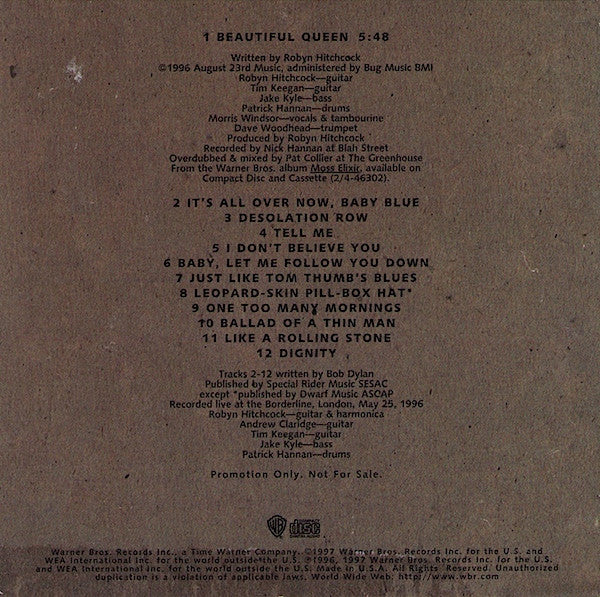 Promotion Only. Not For Sale. Track 1: Recorded at Blah Street Overdubbed & mixed at The Greenhouse (c)1996 August 23rd Music, administered by Bug Music BMI Tracks 2-12: Recorded live at the Borderline, London, May 25, 1996 Published by Special Rider Music SESAC except [track 8 published by Dwarf Music ASCAP Ⓟ 1996, 1997 Warner Bros. Records Inc. for the U.S. and WEA International Inc. for the world outside the U.S © 1997 Warner Bros. Records Inc. and WEA International Inc. for the world outside the U.S. Made in U.S.A. Cardboard sleeve.