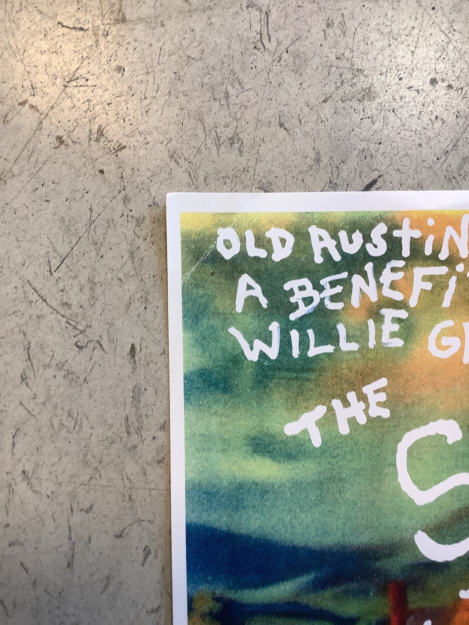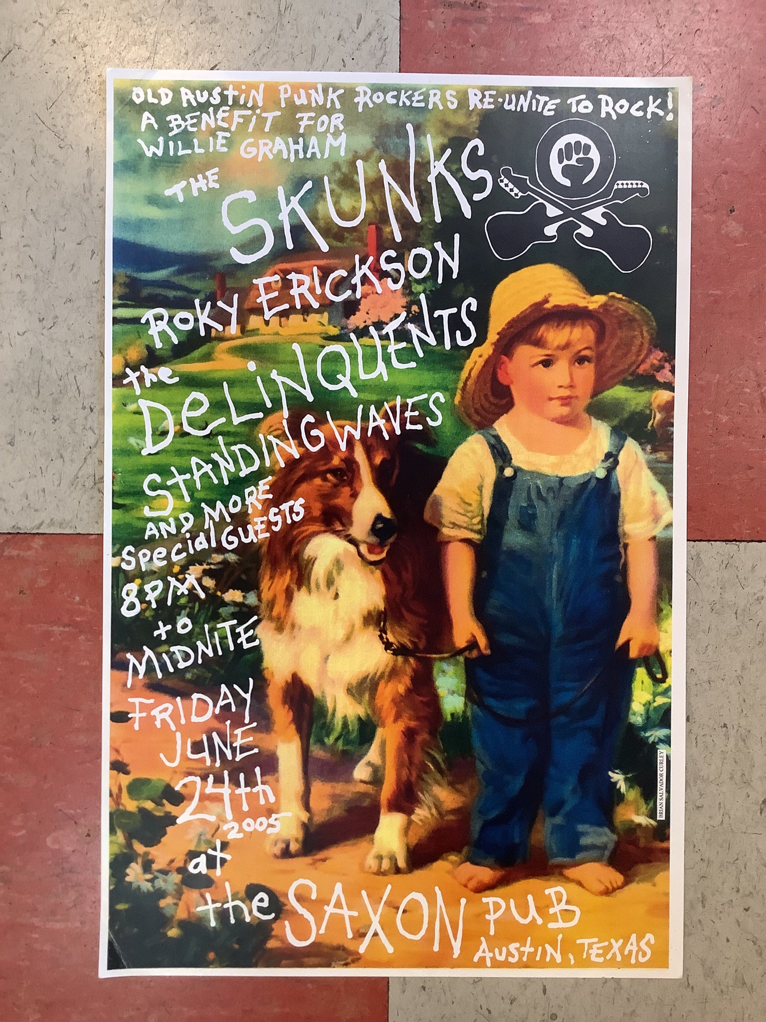 Poster promoting a Willie Graham benefit show featuring performances by The Skunks, Roky Erickson, The Delinquents, Standing Waves, and more. June 24th, 2005 at The Saxon Pub. Designed by Brian Salvador Curley.