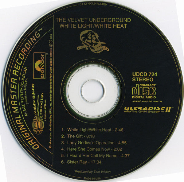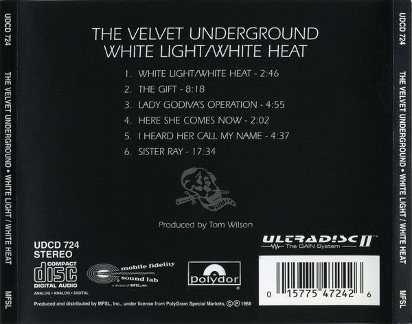The title is printed White Light / White Heat on the spines, lyric booklet and J-card. Produced and distributed by MFSL, Inc. under license from PolyGram Special Markets, ©℗ 1968 Original Master Recording™ Ultradisc II™ The GAIN system Analog - Analog - Digital Made in USA Originally packaged in a Shape CD 2001 'lift lock' jewel case with outer J-card