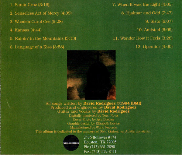 "This album is dedicated to the memory of Sisto Quiroz, an Austin musician." All songs written by David Rodriguez c 1994 (BMI) World Records 603 West 13th Suite 1A Drawer 313 Austin, Texas 78701