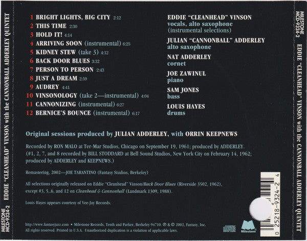 Eddie "Cleanhead" Vinson With The Cannonball Adderley Quintet : Cleanhead & Cannonball (CD, Comp, Promo, RE, RM)