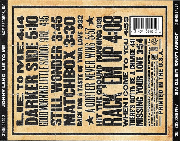 Recorded at Oar Fin Studios, Minneapolis, MN & House Of Blues, Memphis TN Mixed at The House Of Blues, Memphis, TN except "Lie To Me" mxed at The Record Plant, Hollywood, CA Mastered at A&M Mastering Studios, Hollywood, CA ℗ & © 1996 A&M Records, Inc. Track 1 published by Ryan Cory Music(BMI).David Z Music Tracks 2, 9 published by Ryan Cory Music (BMI) Track 3 published by Arc Music Corp. (BMI) Track 4 published by Báshti Music/Trio Music Co., Inc (BMI) Track 5 published by Su-Ma Publishing Company (BMI) Track 6 published by Irving Music, Inc. (BMI) Track 7 published by Frozen Inca Music (BMI) Track 8 published by WB Music Corp./Lunnmusic (ASCAP) Administered by WB Music Corp/Silbar's Songs (ASCAP) Tracks 10, 12 published by Lagny Tunes (ASCAP)/Little Shop Of Morgansongs Publishing (BMI) Track 11 published by Collins & Collins Music/Ensign Music Corporation (BMI)
