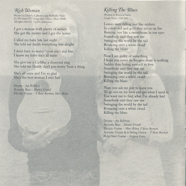 Regular jewel case edition. Recorded at Sound Emporium, Nashville, TN; Electro Magnetic Studios, Los Angeles, CA; The Village Recorder, Los Angeles, CA; Sage & Sound, Hollywood, CA. Mixed at Electro Magnetic Studios, Los Angeles, CA. Mastered at Lurssen Mastering, Hollywood, CA. Publishing details: track 1: © 1955 Sony/ATV Songs LLC / Venice Music (BMI) track 2: Graph Music (ASCAP) track 3: © Eden Bridge Music (ASCAP). Administered by Bug Music track 4: © 1969 Irving Music, Inc. (BMI) track 5: © 1964 Sony/ATV Songs LLC / Acuff Rose Music (BMI) track 6: © 1969 Irving Music, Inc. (BMI) track 7: BMG Songs (ASCAP) / BMG Music Publishing International Ltd. (PRS) / Sons of Einion Limited (PRS) / Succubus Music Ltd. (PRS). All rights for the US on behalf of BMG Songs. Administered by BMG Songs. track 8: Jalma Music (ASCAP) track 9: © 1962 renevew 1990 Unart Music Corporation. Rights assigned to EMI Catalogue Partnership. All rights controlled and administered by EMI Unart Catalog Inc., (BMI). track 10: © 1960 Universal-Cedarwood Pub. (BMI) track 11: © 1970, 1999 (renewed) JTVZ Music (ASCAP) / Katie Belle Music (ASCAP) / Will Van Zandt Publishing (ASCAP). Administered by Bug. track 12: © 2000 Trice Publishing Co. (BMI) administered by Bug. track 13: © Hillgreen Music (BMI) On back cover: © & ℗ 2007 Rounder Records Corp. On disc: ℗ & © 2007 Rounder Records Corp. Manufactured in the USA.