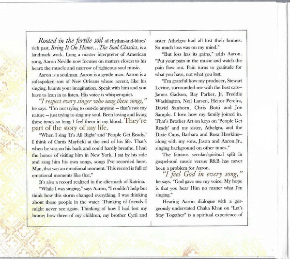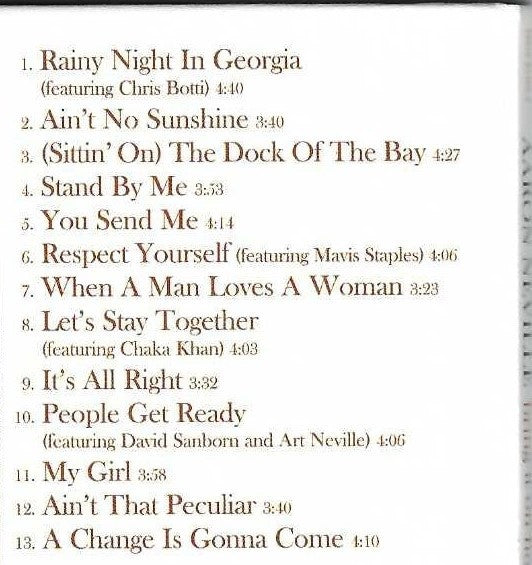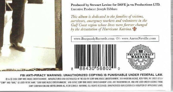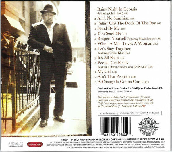℗ & © 2006 Sony BMG Music Entertainment. Manufactured and distributed by Sony BMG Music Entertainment, 550 Madison Avenue, New York, NY 10022-3211. Recorded & mixed at Ocean Way Studios, Hollywood, CA Additional recording at: Paragon Studios, Franklin, TN; Piety Street Recording, New Orleans, LA; Hiatus Studios, New York City; C.R.C. Studios, Chicago, IL Mastered at Bernie Grundman Mastering, Hollywood, CA Management: Kent Sorrell for Elevation Group, Inc. Art Direction & Design: Jeff Schulz @ Command-Z-Design Groomer: Kyoko Motonaga for Ultra Track 1: Published by Clig Music Publishing (ASCAP), Combine Music Corp. (BMI) Track 2: Published by Interior Music Corporation/Songs of Universal, Inc. (BMI) Track 3: Published by Irving Music, Inc. (BMI) Track 4: Published by Jerry Lieber (sic) Music (ASCAP), Mike Stoller Music (ASCAP), Mike & Jerry Music L.L.C. (BMI), Anne Marie Aberbach Trust Cherry Lane Music Publishing Co. obo Susan Aberbach Track 5: Published by ABKCO Music, Inc. (BMI) Track 6: Published by Irving Music, Inc. (BMI) Track 7: Published by Pronto Music (BMI), Quinvy Music Publishing Co. (BMI) Track 8: Published by Al Green Music, Inc. (BMI), Al Jackson, Jr. Music (BMI), Irving Music, Inc. (BMI) Track 9: Published by Warner-Tamerlane Publishing Corp. (BMI) Track 10: Published by Warner-Tamerlane Publishing Corp. (BMI) Track 11: Published by Jobete Music Co., Inc./EMI Music Publishing, Inc. (ASCAP) Track 12: Published by Jobete Music Co., Inc./EMI Music Publishing, Inc. (ASCAP) Track 13: Published by ABKCO Music, Inc. (BMI) This album is dedicated to the families of victims, survivors, emergency workers and volunteers in the Gulf Coast region whose lives were forever changed by the devastation of Hurricane Katrina. CD is packaged in a 6-panel (trifold sleeve) along with an 8-pages (stapled) Booklet, notes in English. This release is nearly identical to [r4979315, but the barcodes are different.