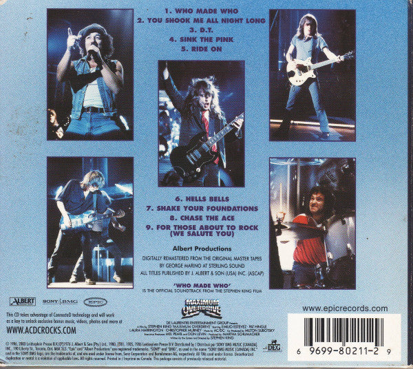 The official soundtrack from the Stephen King Film 'Maximum Overdrive'. Digitally remastered from the original mix-down 2-track master tapes at Sterling Sound. This CD takes advantage of ConnecteD technology and will work as a key to unlock exclusive bonus music, videos, photos and more at www.acdcrocks.com All songs published by J. Albert & Son (USA) Inc. (ASCAP) Made in Canada. CD housed in a Digipak