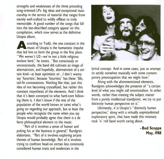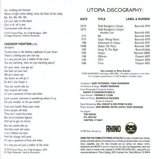 Track 1 (P)1983 Neo-Utopian Laboratories, Ltd. & Tracks 3 & 10 (P)1985 Passport Records, Inc. licensed from Passport Records/Jam Records. Track 11 (P)1982 Network Records, licensed from Network Records. All Other Tracks (P)1974, 1975, 1977, 1980 & 1982 Bearsville Records, Inc. Issued under license from Bearsville Records, Inc.