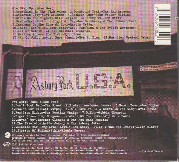 Double digipak in a slipcase with clear tray and illustrated tray-liner + 16-page booklet with notes, credits and pics. Some copies came with a square sticker. Back cover: All songs published by Bruce Springsteen (ASCAP) One dollar from the sale of this album will go to World Hunger Year ℗ © 1997 The Right Stuff Booklet: Track 1-1: Recorded 7/96 at Kingsley Gardens Studio, Los Angeles, CA. Mixed at Sound Of Atlantis Track 1-2: Recorded 1/24/97 at Chicago Recording Company, Chicago, IL. Track 1-3: Mastered at Gateway Mastering Track 1-4: Produced, engineered & mixed at Ordophon-Upon-Avon, San Francisco, CA Track 1-5: Recorded 6/97 at Audio Artistry, Beltsville, MD Track 1-6: Recorded in August 1997 Track 1-7: Recorded & mixed 3/31/97 at Arlyn Studios, Austin, TX Track 1-8: Engineered & mixed 6/97 - 7/97 at Studio L, Weirton, WV Track 1-9: Recorded February 4, 11 & 12, 1997 at Albatross Studios, Minneapolis, MN Track 1-10: Recorded & mixed 7/97 at DV Studio, Milwaukee, WI Track 1-11: Recorded 7/19/97 at Squashophonic Recording, Woodstock, NY Track 1-12: Recorded & mixed 7/28-29/97 at Kampo Cultural Center, NYC Track 1-13: Recorded in July 1997 at Jolly Roger Recording, Hoboken, NJ. Mixed at Mission Sound, Brooklyn, NY Track 1-14: Recorded 1/18/97 at Nexus Recording, Milwaukee, WI Track 2-1: Recorded 4/79 at MCA Whitney Studios, Los Angeles, CA Track 2-2: Recorded & mixed at Westlake Audio, LA Track 2-3: Recorded & mixed at Ocean Way, Hollywood, CA Track 2-4: Recorded 10/20/95 at ICP Studios, Brussels Track 2-5: Recorded in 1975 at Cherokee Studios, Hollywood, CA Track 2-7: From the Out There Records 1985 LP release [r9717294 Track 2-8: Recorded & mixed at Moondog Studio, Nashville, TN Track 2-9: Recorded at The Power Station, New York, NY. Mixed at Clover Recording Studios, Los Angeles, CA Track 2-10: Recorded & mixed at The Record Plant, NYC Track 2-11: Mixed & mastered at The Record Plant, NYC Track 2-12: Recorded live 6/79 at the "Music Machine" in London by the Davout Studio Mobile. Remixed at Davout Studios, Paris, France. Recorded for the RCA/France album [m733580 Track 2-13: Recorded at Morgan Studios Track 2-2 produced by Quincy Jones for Quincy Jones Productions. Under license from Polygram Special Markets, a Division of PolyGram Group Distribution, Inc. Track 2-5 licensed courtesy of EMI Records Ltd. Track 2-8 produced by Garry Tallent for Mr. E. Train. Tracks 2-10 & 2-11 under license from Sony Music Special Products, a Division of Sony Music, a Group of Sony Music Entertainment Inc. Mastering at Digiprep, Los Angeles, CA Runouts: All is stamped except the sequence X-X-X which is laser-etched and mirrored
