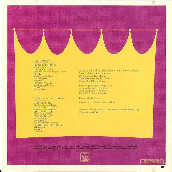 Stuart Ostrow presents a musical comedy by Roger O. Hirson. ©℗ 1972 Motown Record Company, L.P. Publishers: Jobete Music Co., Inc./ Belwin-Mills Publishing Corp. All selections (ASCAP). Trademark Motown Record Corporation Original Cast Recording is written on the Cd spine art, Cd face and on the rear sleeve artwork. Original Cast Album is written only on the front cover artwork. Originally released in 1972.