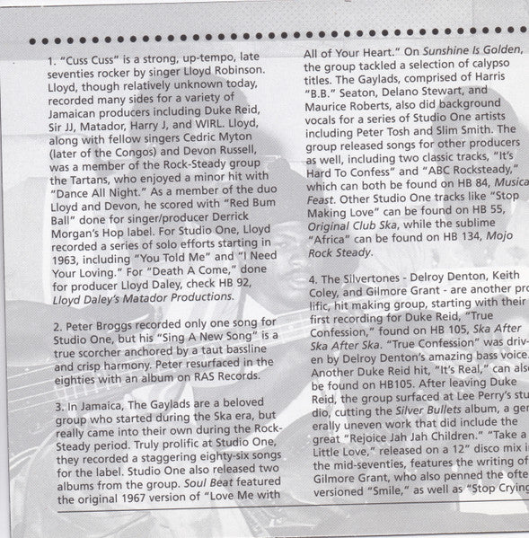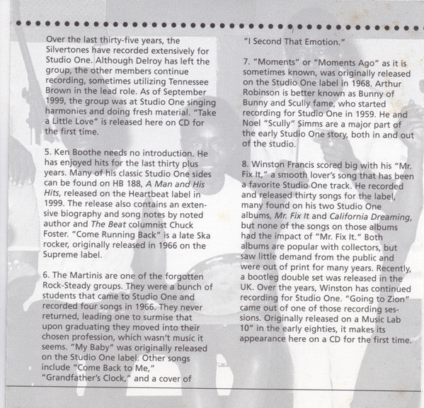 Many of the songs on Rare Reggae Grooves From Studio One were originally released in the late sixties and re-released in their extended version ten years later. (Originally released as Studio One showcase Volume 2)