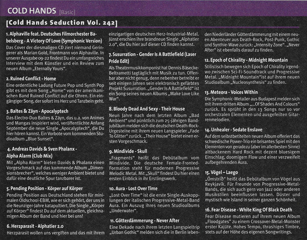 Cardboard, came with Sonic Seducer Magazine 10/2022; incl [r24789155 Tracks taken from the album: 1. "[m2796116" (Edel Distribution/Neue Meister), publ. by Budde Music Publishing GmbH 2. EP "[m2753045" (Infacted Recordings/Soulfood/Bieleve Music) 3. "Blue Sunset" (Echozone/BOB-Media Distribution/Believe) 4. EP "[r24807425" (Infacted Recordings/Soulfood/Bieleve Music) 5. Single "[r23209565" (Infacted Recordings/Soulfood/Bieleve Music) 6. Single "[r24763139" (Echozone/BOB-Media Distribution/Believe), publ. by 7. "Make Love Like War" (Susurration Music) 8. "[m2800127" (Alice In.../Dark Dimensions Label Group/Broken Silence) 9. "[r24606263" (My Kingdom Music) 10. "[r24674297" (My Kingdom Music) 11. "[m2821412" (Alice In.../Dark Dimensions Label Group/Broken Silence) 12. "[r=26943083"; credited here as "Caravan to the Midnight Mountain" (Wormholedeath/The Orchard/Sony Music Entertainment), publ. by Carlo Bellotti Publishing 13. "[m2824256" (H-Music) 14. "Unhealer" (Wormholedeath/The Orchard/Sony Music Entertainment), publ. by Carlo Bellotti Publishing 15. "Ómstríð" (Wormholedeath/The Orchard/Sony Music Entertainment), publ. by Carlo Bellotti Publishing 16. "Floodgates" (Wormholedeath/The Orchard/Sony Music Entertainment), publ. by Carlo Bellotti Publishing