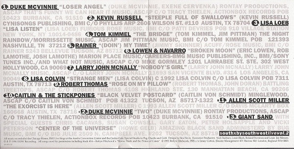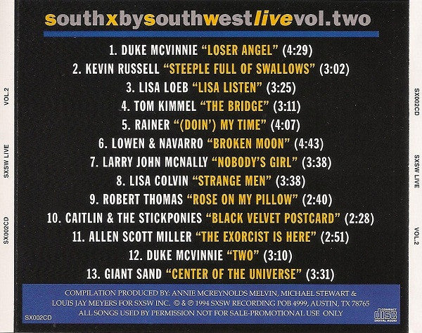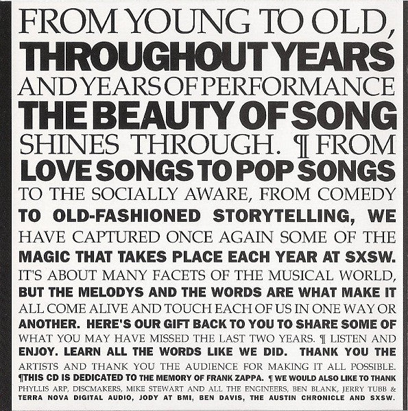 All music recorded live at the Chicago House, BMI Live Stage at the Austin Convention Center and the Cactus Cafe. Produced for SXSW Inc. (c)&(p) 1994 This CD is dedicated to the memory of Frank Zappa. Made in USA.