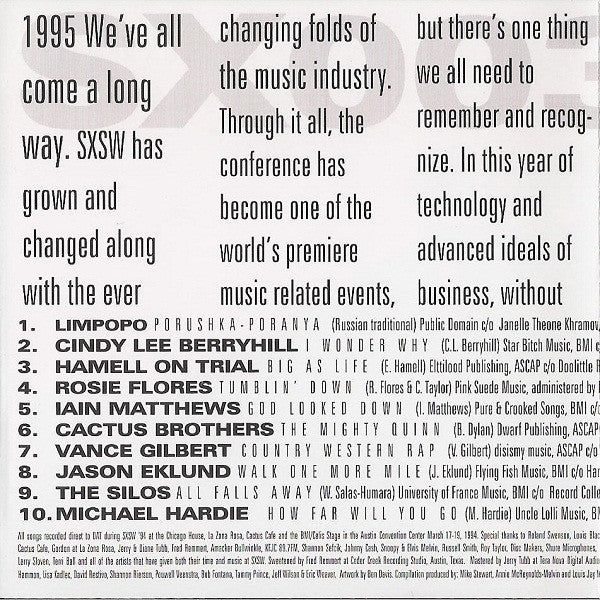 All songs recorded direct to DAT during SXSW at the Chicago House, La Zona Rosa, Cactus Cafe and the BMI/Celis Stage in the Austin Convention Center March 17-19, 1994. Produced for SXSW Inc. (c) & (p) 1995 Made in USA. Track 11 is unlisted/uncredited on the packaging and is simply an outtake of E. Hamell talking to the crowd before playing his song Big As Life (track 3).