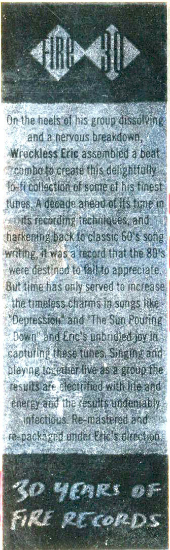 Reissued to coincide with Record Store Day, celebrating 30 years of Fire Records and Wreckless Eric's 60th birthday. Remastered CD reissue overseen by Wreckless Eric. Sixteen page booklet contains new liner notes from Eric. Gatefold card cover with disc in a white Fire Records inner sleeve.