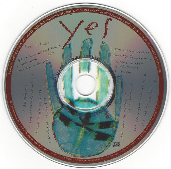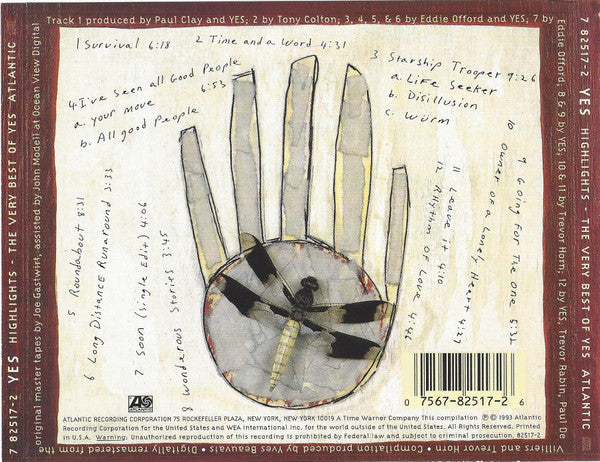 Digitally remastered from the original master tapes, assisted at Ocean View Digital, West Los Angeles, California. ℗ © 1993 Atlantic Recording Corporation. Made in U.S.A. by WEA manufacturing Inc. 8-page insert folds out into a 4x4 poster. Track 1 recorded at Advision & Trident Studios, London, Spring 1969. Originally released on "Yes" on July 25, 1969 (UK) and October 15, 1969 (US). Track 2 recorded at Advision & Trident Studios, London, late 1969/early 1970. Originally released on "Time And A Word" in July 1970 (UK) and on November 2, 1970 (US). Tracks 3, 4 recorded at Advision Studios, London, October/November 1970. Originally released on "The Yes Album" on March 19, 1971. Track 5 recorded at Advision Studios, London, September, 1971. Originally released on "Fragile" on November 1, 1971 (UK) and on January 4, 1972 (US). Also released as a single (Atlantic 45-2854) on January 4, 1972. Track 6 recorded at Advision Studios, London, August/September 1971. Originally released on "Fragile" on November 1, 1971 (UK) and on January 4, 1972 (US). Also released on the flipside on the "Roundabout" single on January 4, 1972. Track 7 recorded on mobile equipment, 1974. Originally released as a single (Atlantic 45-3242) on January 8, 1975. Also included in "The Gates Of Delerium" from the "Relayer" album. Tracks 8, 9 recorded at Mountain Studios, Montreux, Switzerland, late 1976/early 1977. Originally released on "Going For The One" on July 7, 1977. Also released as a single (Atlantic 3416) on September 7, 1977. Track 10 recorded at Sarm Studios, London, Spring and Summer, 1983. Originally released on "90125" on November 7, 1983. Also released as a single (Atco 99817) on October 24, 1983. Track 11 recorded at Sarm Studios, London, Spring and Summer 1983. Originally released on "90125" on November 7, 1983. Also released as a single (Atco 96976) on March 14, 1984. Track 12 recorded at Lake Recording Studios, Caramati, Italy; Sarm East and West Recording Studios, London; Air Studios, London; Southcombe Recording Studios, Los Angeles; and Sunset Sound, Los Angeles. Originally released on "Big Generator" on September 17, 1987. Also released as a single (Atco 99419) on December 7, 1987.