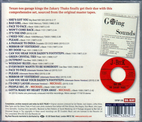 Tracks taken : 1 from single A-side ( 2013 ) [J-Beck Records NW 505 / JAX NW 505 On booklet Big Beat NW 505. 2 & 6 from single A and B-side ( 1966 ) [J-Beck Records J 1006 & [Mercury 72633 3 & 14 from single A and B-side ( 1967 ) [J-Beck Records J 1009 4 & 7 from single B and A-side ( 1967 ) [J-Beck Records J 1101 5 and 16 to 20 previously unissued mid-60s recordings 8 from CD compilation " Passage To India " ( 2010 ) [Cicadelic Records CICD 9665 9 & 11 from single A and B-side ( 1967 ) [J-Beck Records J 1103 10 & 12 from single A and B-side ( 1968 ) [Thak Records 1001 13 & 15 from single B and A-side ( 1969 ) [Cee-Bee Records 1005 21 & 22 from single B and A-side ( 1967 ) [J-Beck Records J 1008 credited to Michael ( Mike Taylor ) Tracks 1 to 16 and 20 to 22 are mono. Tracks 17 to 19 are stereo. Tracks published : 1 Rockin' Music 6 Edward Kassner Music Co Ltd. 2 to 5 and 7 to 22 Cicadelic Music BMI