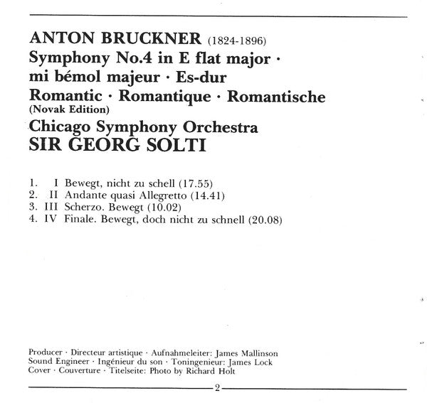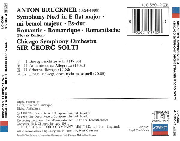Full silver hub, empty, no "MADE IN ..." nor any other additions or engraved letters. First copies came in a smooth edged jewel case. Track 1 "Bewegt, Nicht, Zu Schnell" is misspelled as "Bewegt, Nicht, Zu Schell" on the back sleeve and the booklet. [Back sleeve Digital Recording Enregistrement numérique Digital-Aufnahme ℗ 1981 The Decca Record Company Limited © 1983 The Decca Record Company Limited The Decca Record Company Limited, London, England CD is manufactured by PolyGram in Hanover, West Germany Printed in West Germany/Imprimé en Allemagne. Made in West Germany [CD print ℗ 1983 The Decca Record Co. Ltd. London Made in W-Germany