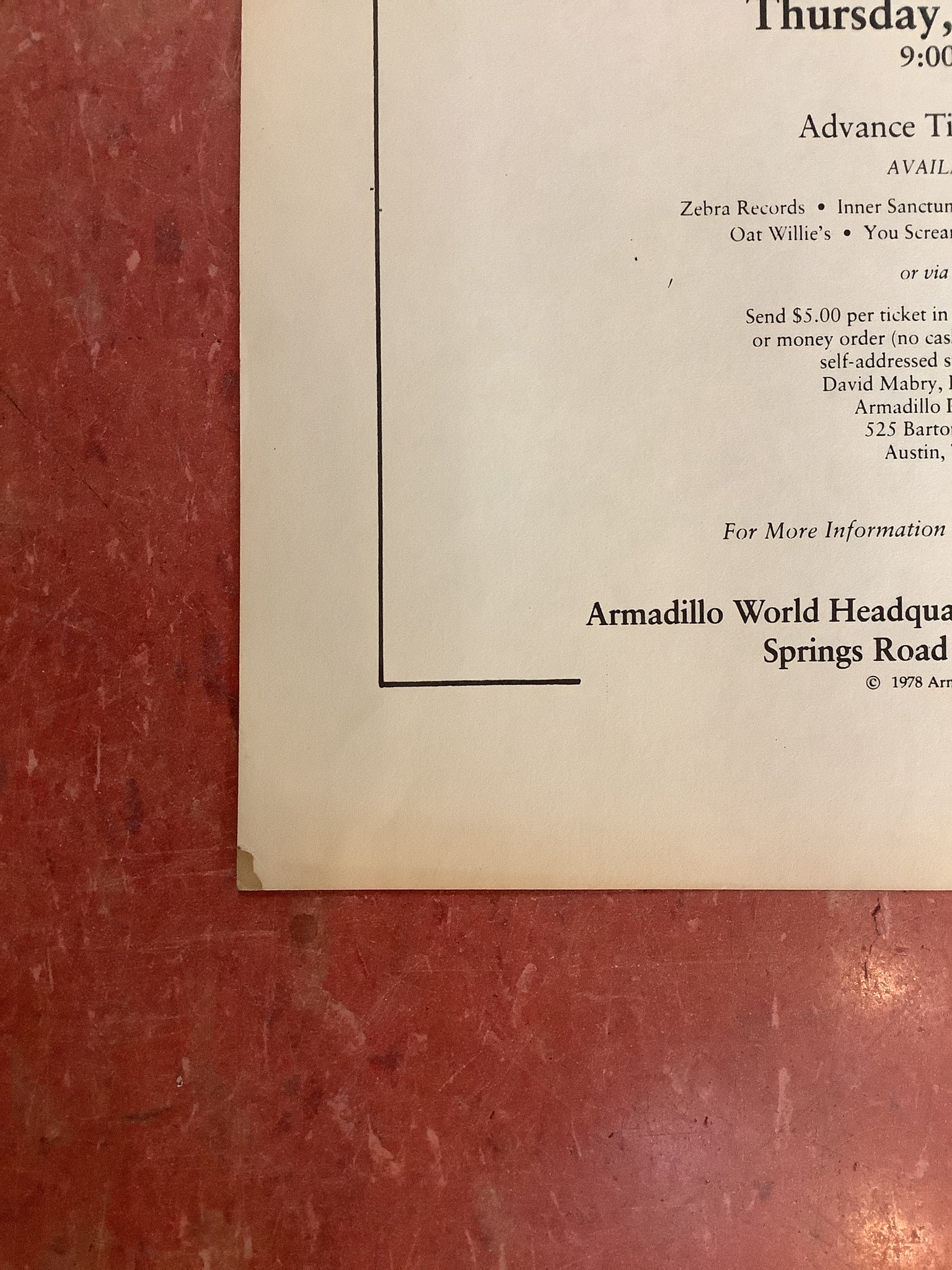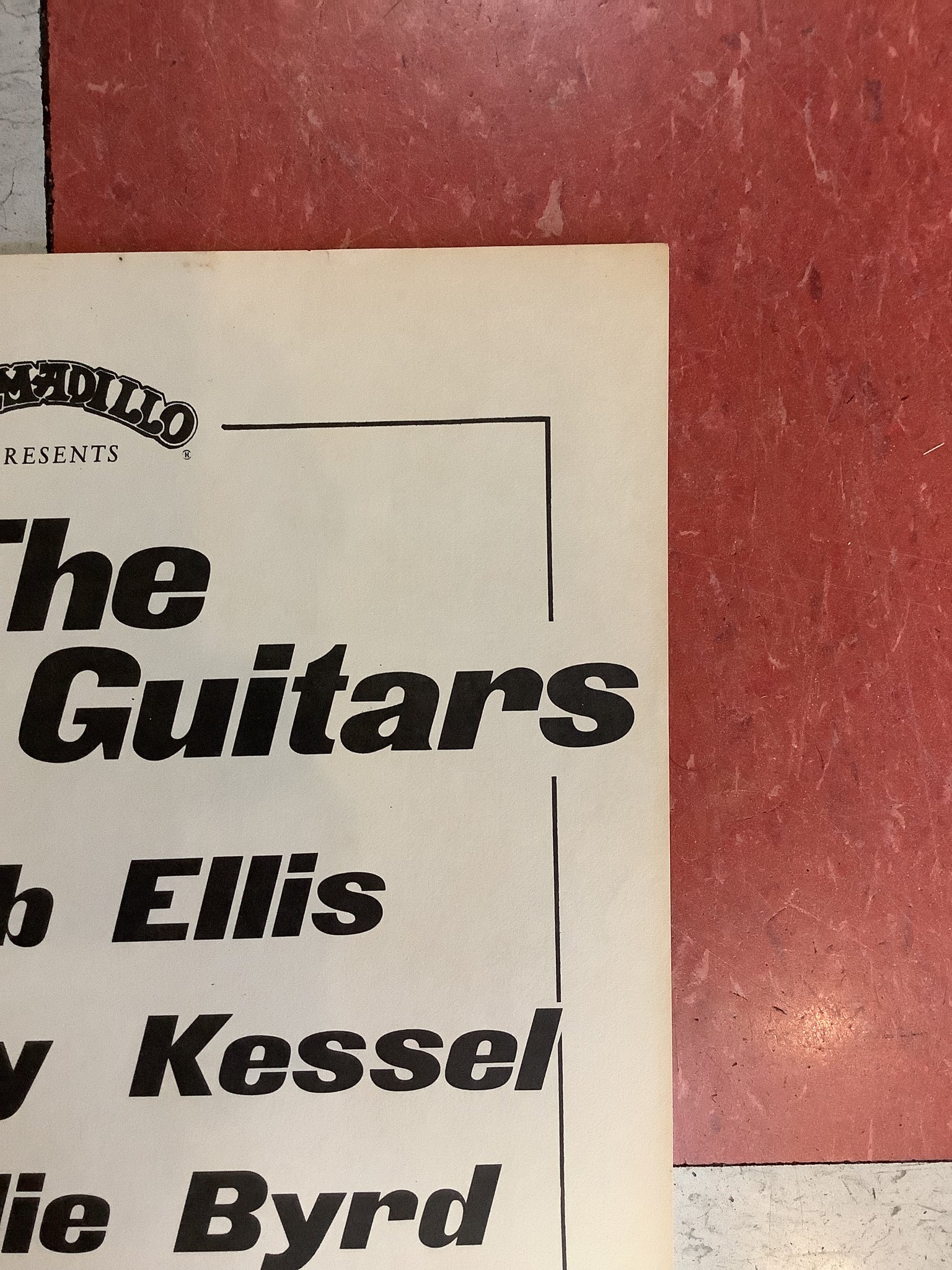 Vintage Armadillo World Headquarters poster promoting a show with "The Great Guitars": Herb Ellis, Barney Kessel, and Charlie Byrd on August 31st, 1978.