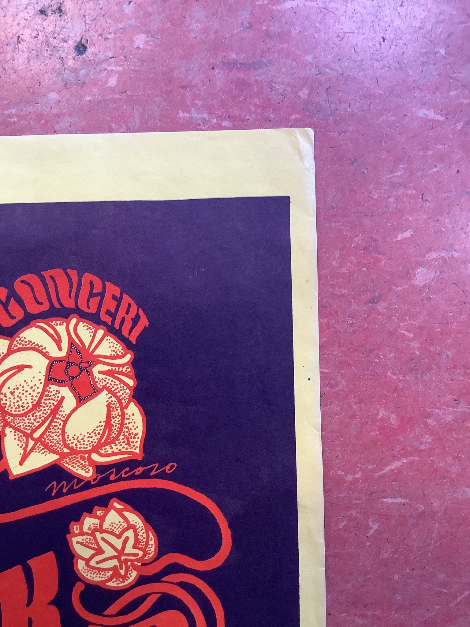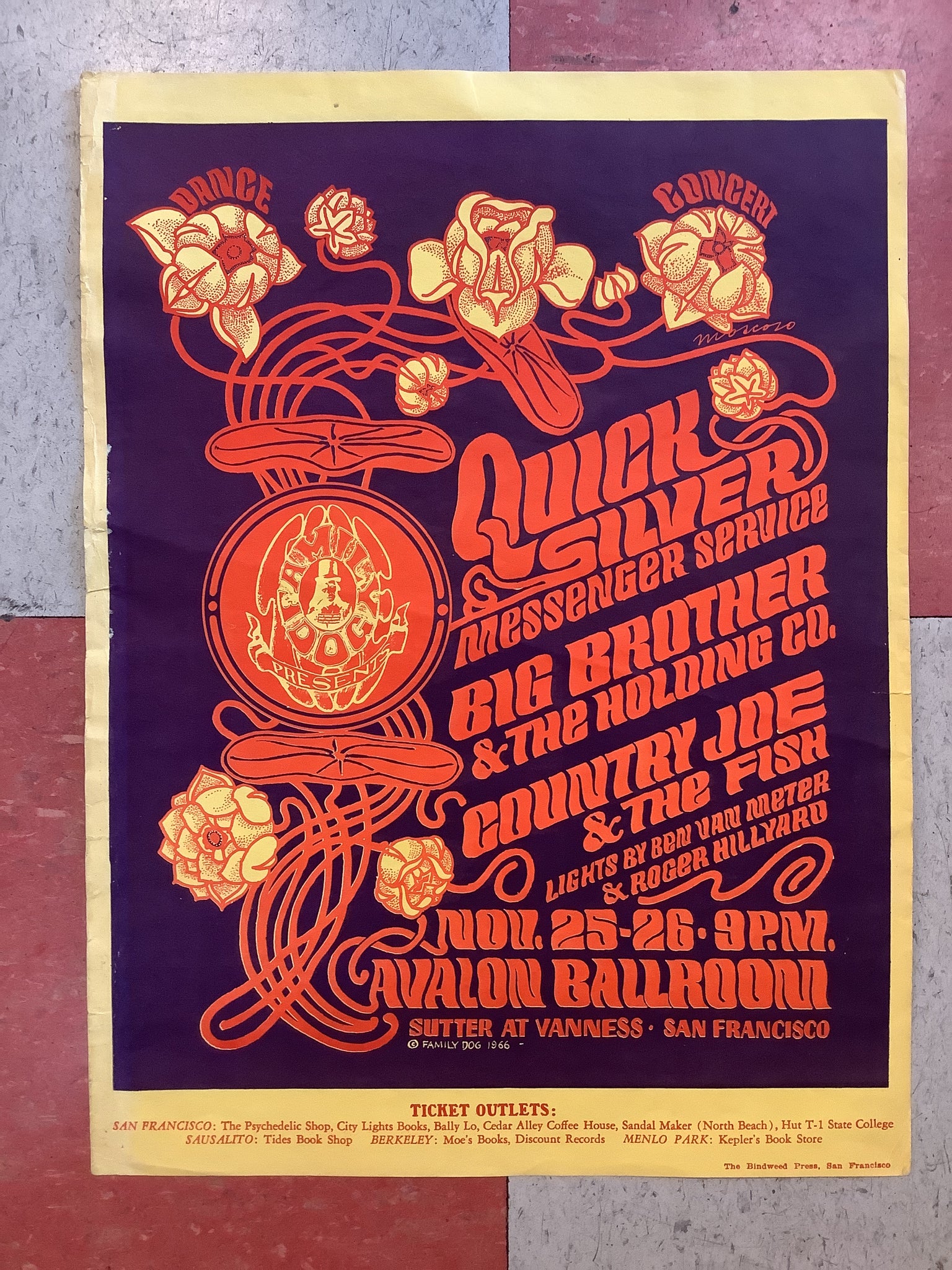 Vintage poster promoting shows with Quicksilver Messenger Service, Big Brother & The Holding Co., & Country Joe & The Fish at Avalon Ballroom on November 25 & 26 in 1966. Designed by Victor Moscoso. FD36 50 written in pencil on the back.