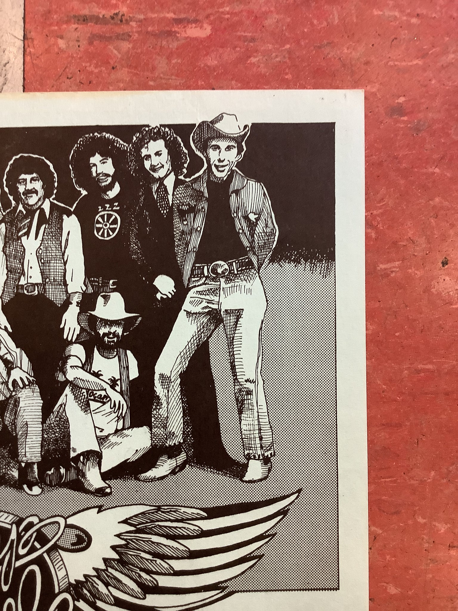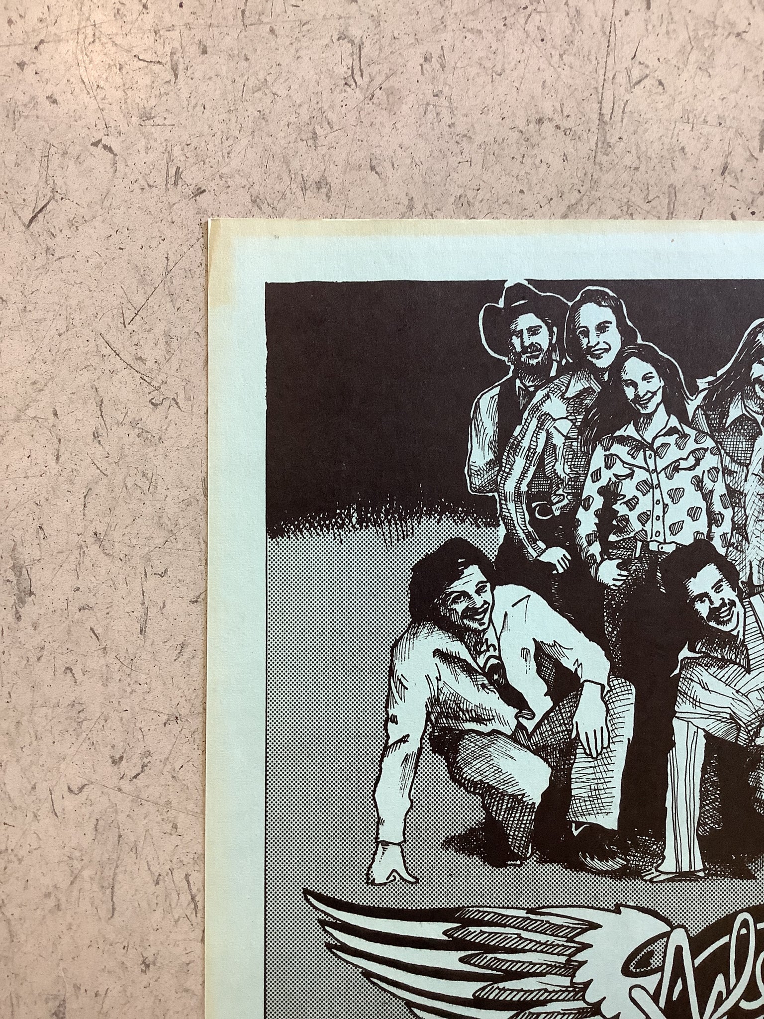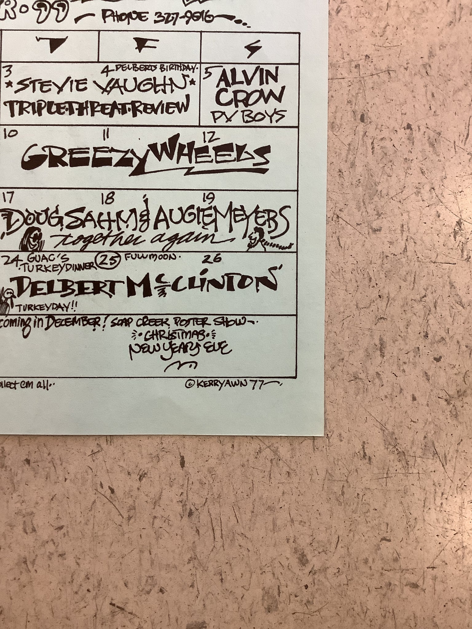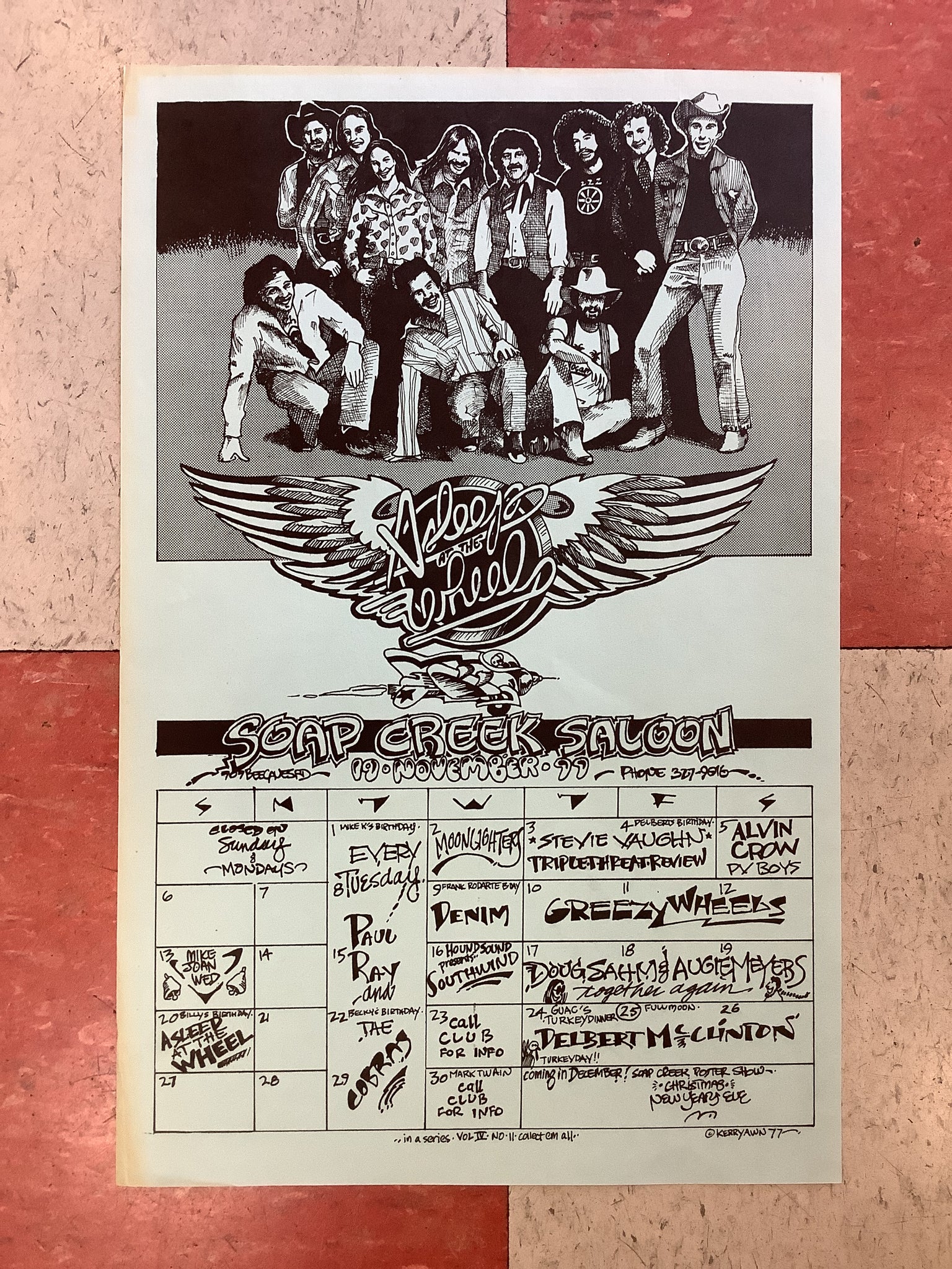 Vintage Soap Creek Saloon poster designed by Kerry Fitzgerald (signed Kerry Awn). Performers this month include Asleep at the Wheel, Paul Ray and The Cobras, Stevie Ray Vaughn, Greezy Wheels, Doug Sahm and Augie Meyers, Moonlighters, Delbert McClinton, Alvin Crow and the Pleasant Valley Boys.