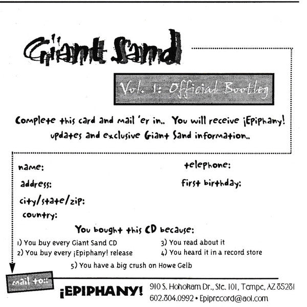Some info (track durations, personnel) is taken from the official sa-wa-ro.com website. Cardboard "discfolio" envelope-type cover. Includes a form which the buyer could fill out and mail back to ¡Epiphany! Records to receive updates and exclusive Giant Sand information. Published by Amazing Black Sand adm. Bug Music Track 3: Slightly extended start to that on "107316" Track 4: Backing is "Blue Waltz Reprise" from "360473" Tracks 5 & 13: Same as "107316" Track 10: Live recording of track from "107316"