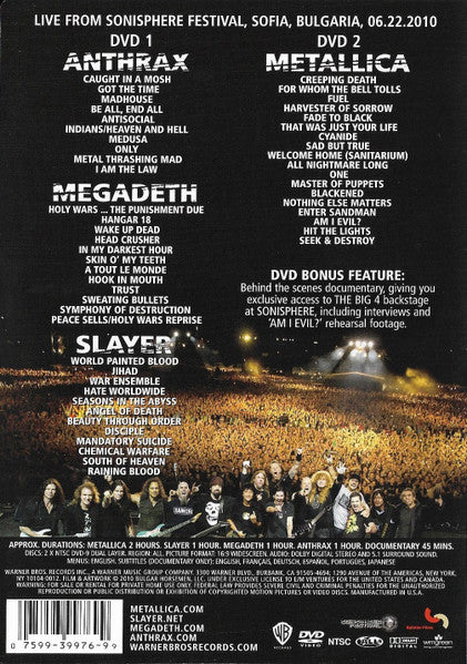 Recorded live in Sofia, Bulgaria, on June 22, 2010. DVD 2 bonus feature: Behind the scenes documentary, giving you exclusive access to The Big 4 backstage at Sonisphere, including interviews and "Am I Evil ?" rehearsal footage.
