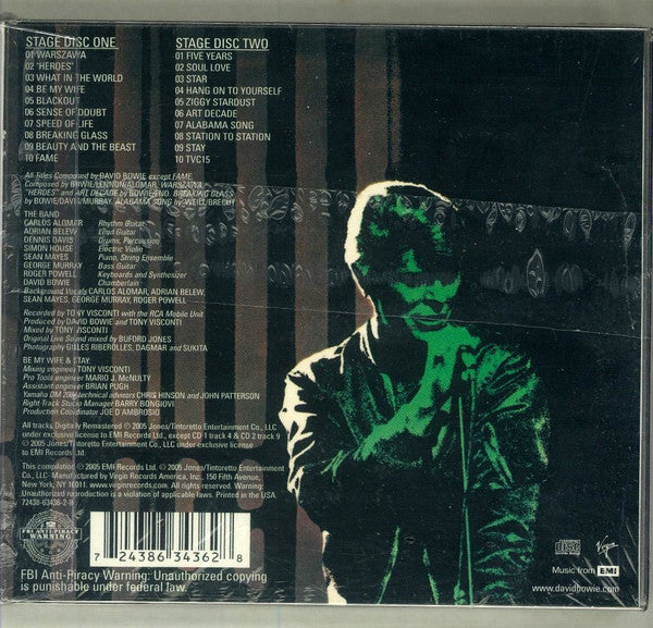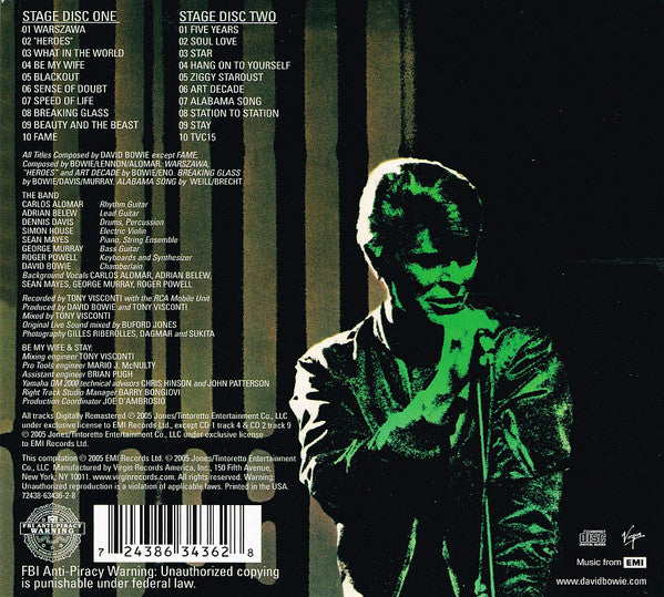2xLP originally released in 1978 as RCA CPL2-2913. Recorded in 1978 at the Philadelphia, Spectrum Arena (Apr 28/29), Providence, Civic Center (May 5) and Boston, New Boston Garden Arena (May 6). This reissue digitally remastered with Tracks 1-4, 2-7 and 2-9 as bonus tracks. Track 2-7 had previously appeared as a bonus track on RCD 10144/45 released on 1991.The original running order of the concerts was restored for this release (on previous releases, tracks had been ordered chronologically), and fades between songs were removed. Comes in a 5-panel concertina pack with the whole contained in a slip-on, transparent plastic case. Includes commentary about the recordings by Tony Visconti. Simultaneously released in 5.1 on DVD-Audio as Virgin 72438-63436-9-7.