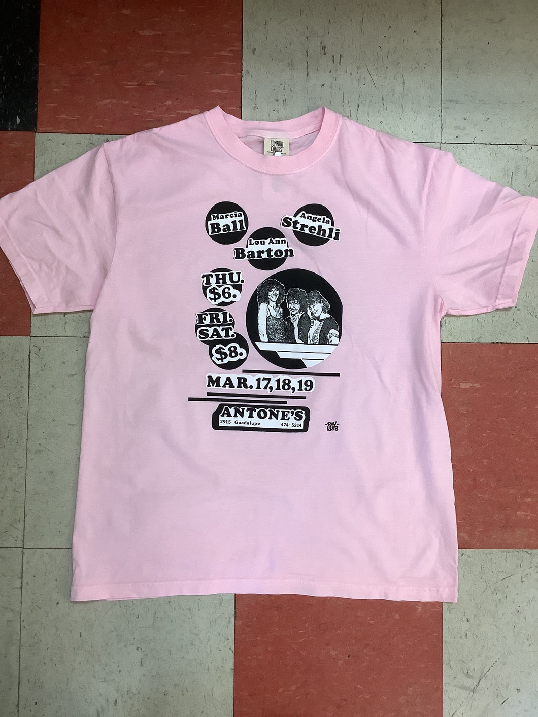 T-Shirt featuring Diana Ray's poster for a 3 show run with Marcia Ball, Lou Ann Barton, and Angela Strehli at Antone's Nightclub in 1988, surrounding the release of Dreams Come True.