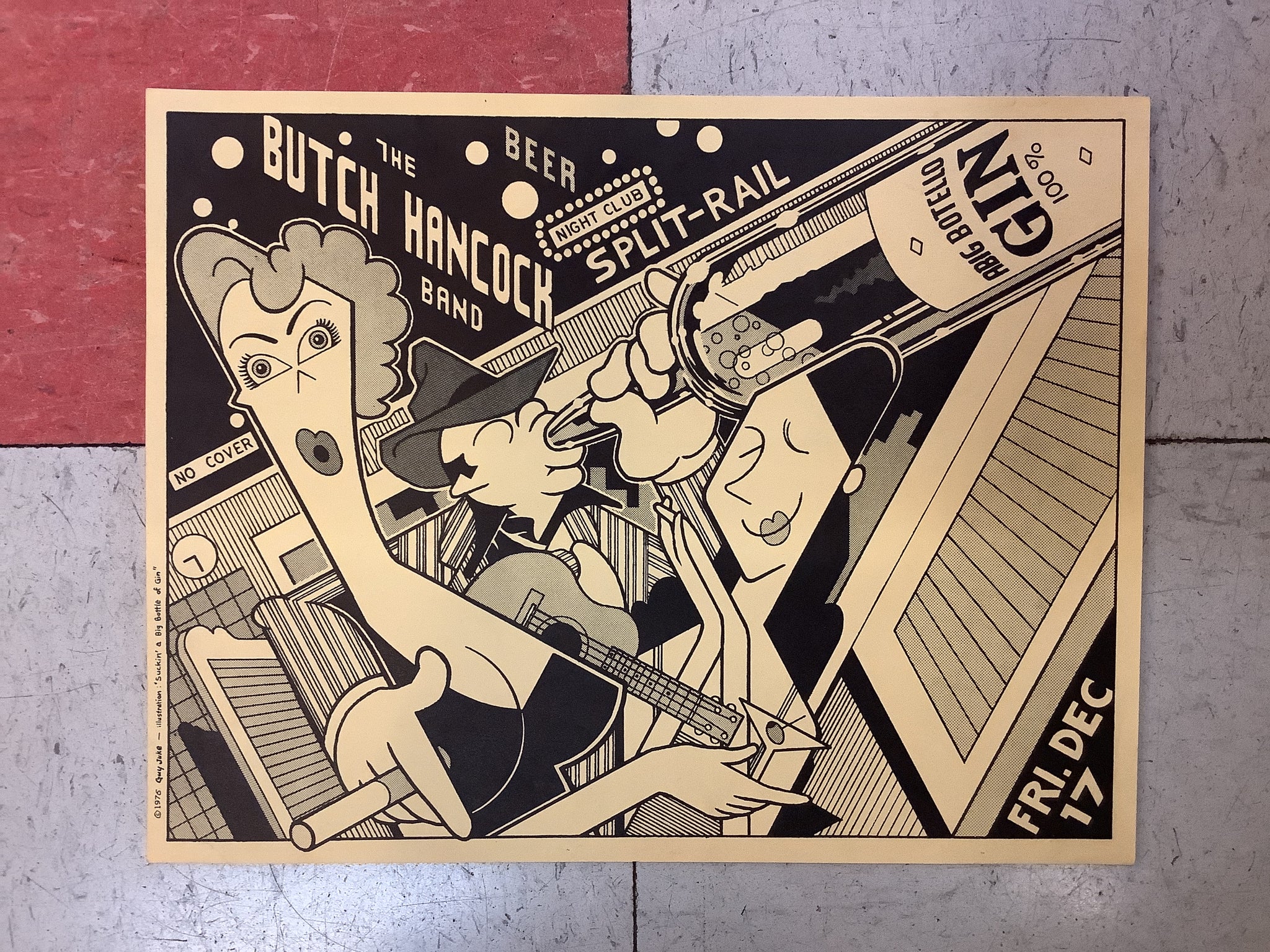 Vintage Split Rail flyer promoting a show with The Butch Hancock Band on December 17th, 1976. Designed by Guy Juke. Signed "Prop. of M. Priest" on the back (Micael Priest).