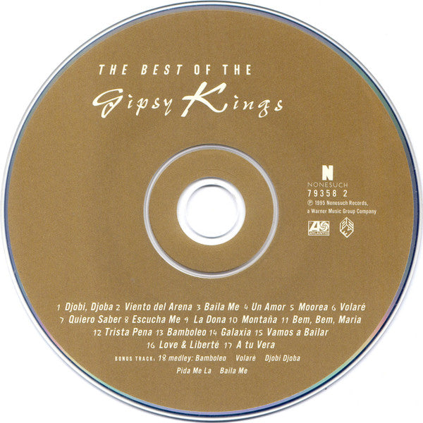 Similar to [r=728151 but the CD was mastered/pressed at WEA Mfg. in Olyphant, PA. Track 17 recorded at Video Village, Montpellier. Tracks 1, 4, 5, 7, 11, 13 ℗ 1988; 2, 6, 12, 15 ℗ 1989; 9, 14 ℗ 1993; 17, 18 ℗ 1995 Nonesuch Records. This compilation © & ℗ 1995 Nonesuch Records. Printed in the U.S.A. Tracks 1, 2, 4, 9, 14 published by Sara Music; 3, 8, 10, 16, 18 published by PEM; 5, 7, 11, 13, 15 published by PEM/Vanessa; 6 published by Edizioni Curci, Milano; 17 published by Songs Music, Inc. All selections ASCAP. Barcode: 0 7559-79358-2 0 Tracks 1, 4, 5, 7, 11, 13 taken from 'Gipsy Kings'; 2, 6, 12, 15 taken from 'Mosaïque'; 3 taken from 'Este Mundo'; 9, 14 taken from 'Gipsy Kings Live'; 8, 10, 16 taken from 'Love & Liberté'; 17 and 18 were unreleased. Catalog number printed as 9 79358-2 on spine and as 79358-2 on disk and booklet. André Reyes is credited as 'Andre Reyes'.