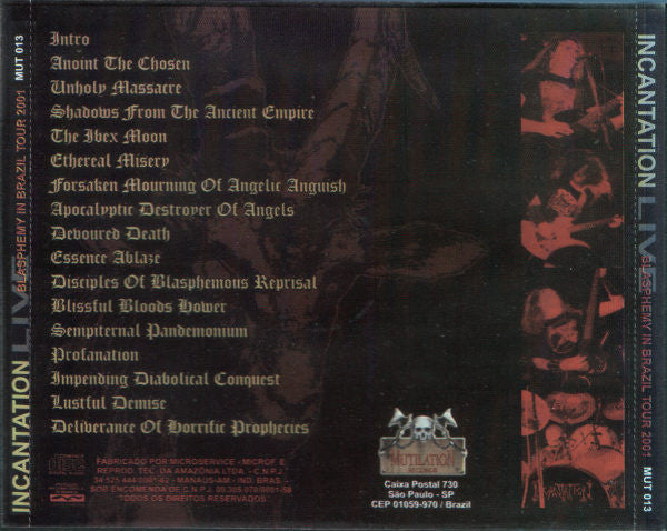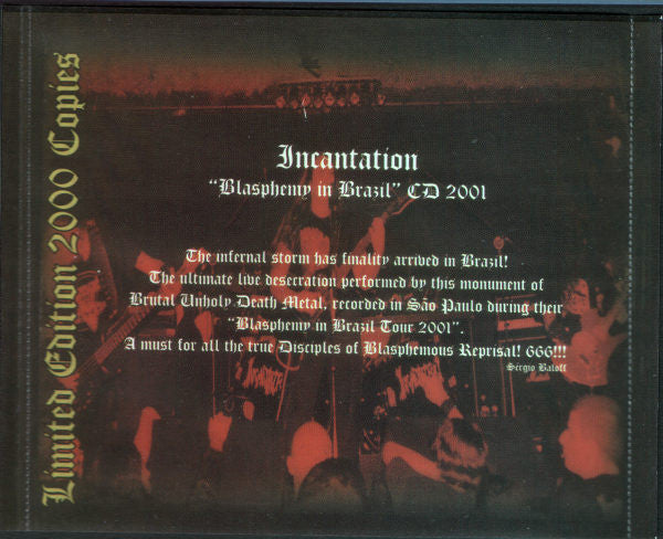 Limited to 2000 copies. Track 12 "Blissful Bloodshower" is misspelled "Blissful Bloods Hower" on the back cover. Live at Hangar 110, Sao Paulo, Brazil, May 11 2001. Mastered at Happy Sound Studios. Tracks 11, 12 & 13 on the back of the CD read as 11 Disciples of Blasphemous Reprisal 12 Blissful Bloods Hower (misspelled) 13 Sempiternal Pandemonium correct tracklist: 11 Disciples Of Blasphemous Reprisal / Blissful Bloodshower 12 Sempiternal Pandemonium 13 Sempiternal Pandemonium (continues) However the songs break at the wrong points and the tracklist above reflects their order. There is no sound lost in the breaks, so it plays seamlessly.