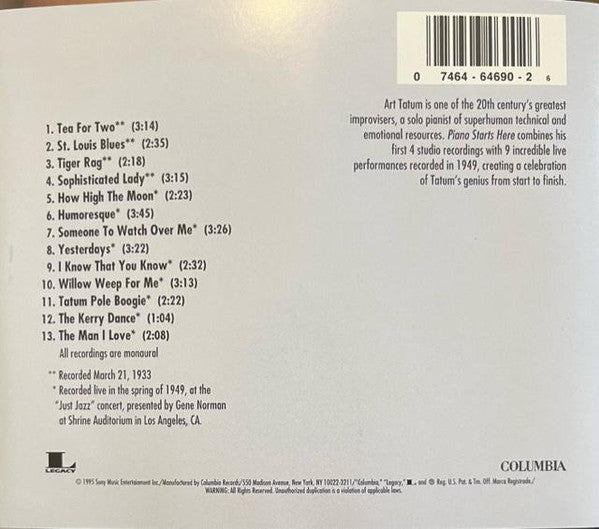 Tracks 1 to 4 recorded March 21, 1933 in the studio. Tracks 5 to 13 reccorded at the "Just Jazz" concert on April, 2, 1949 at the Shrine Auditorium, Los Angeles, California.