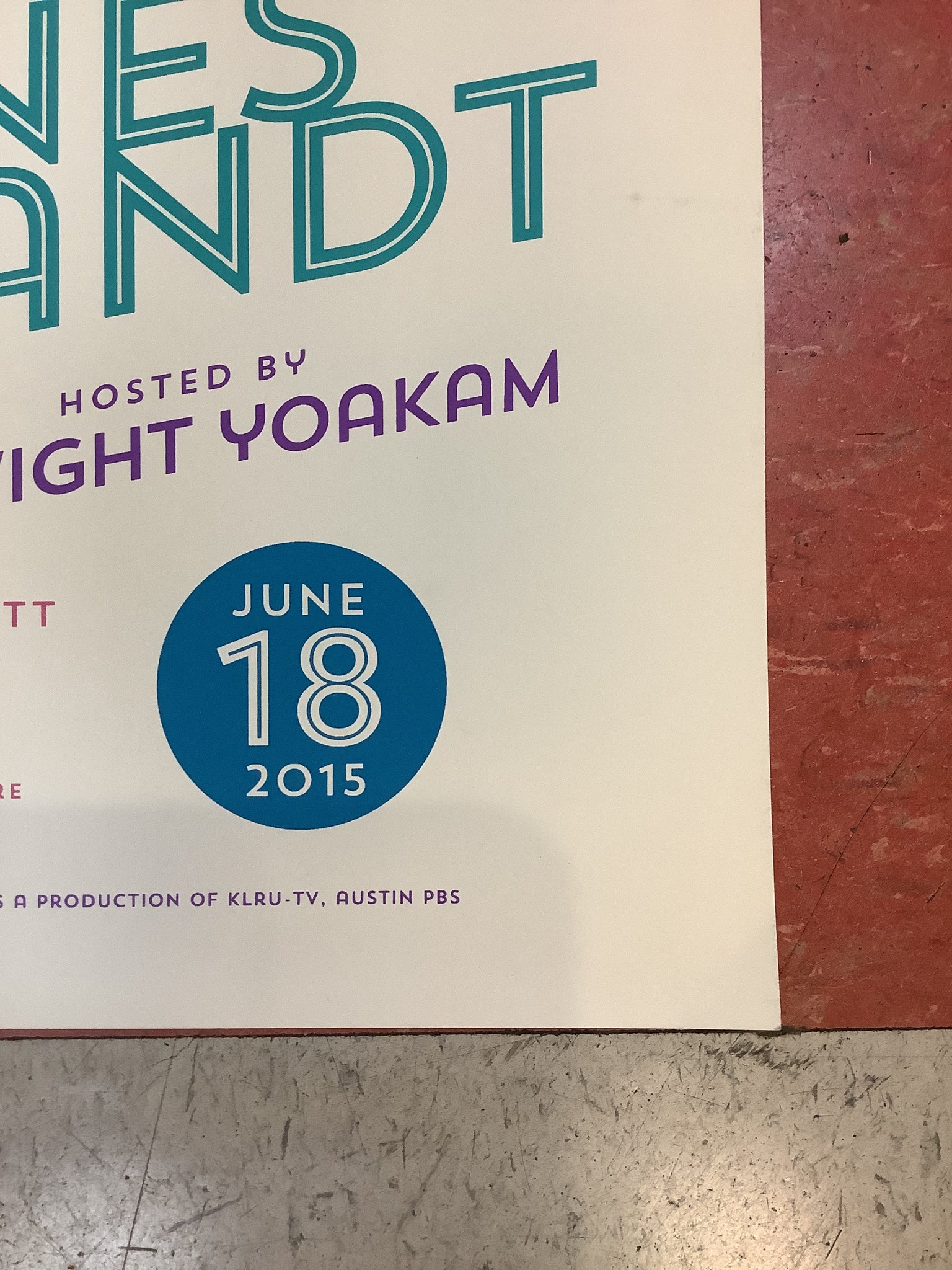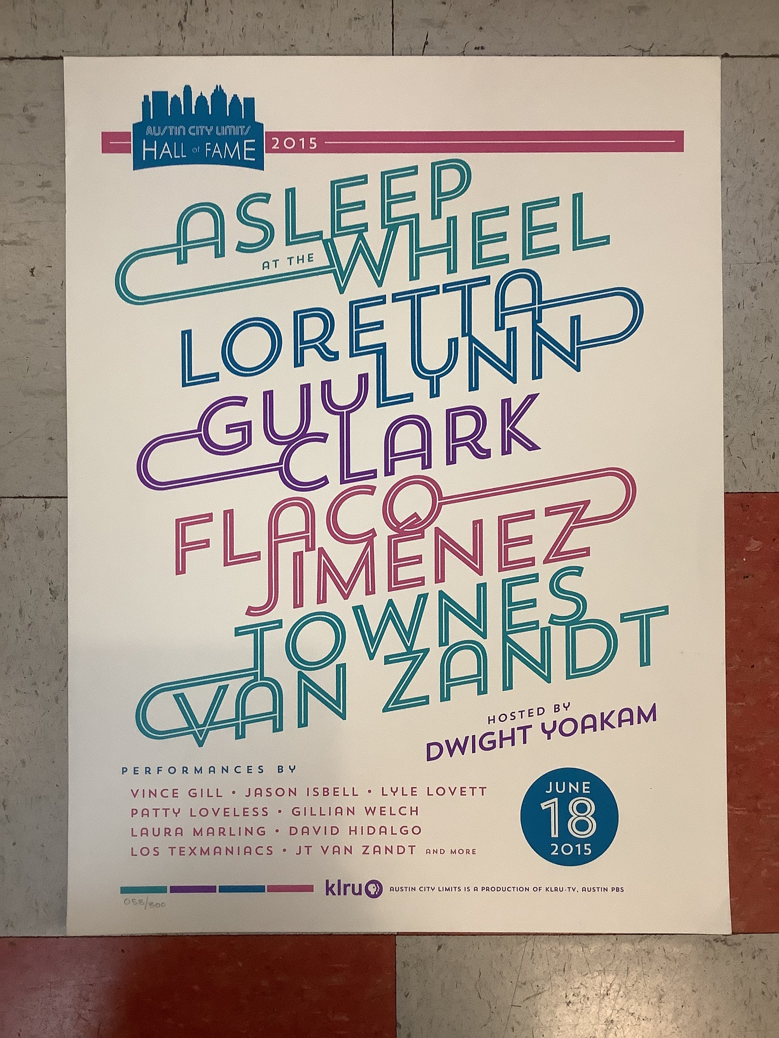 Original poster from the Austin City Limits Hall of Fame episode June 18th, 2015. Celebrating Asleep at the Wheel, Loretta Lynn, Guy Clark, Flaco Jimenez, and Townes Van Zandt. Performers included Vince Gill, Jason Isbell, Lyle Lovett, Patty Loveless, Gillian Welch, Laura Marling, David Hidalgo, Los Texmaniacs, JT Van Zandt, and more! Hosted by Dwight Yoakam.
