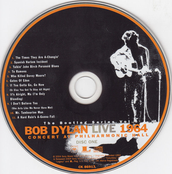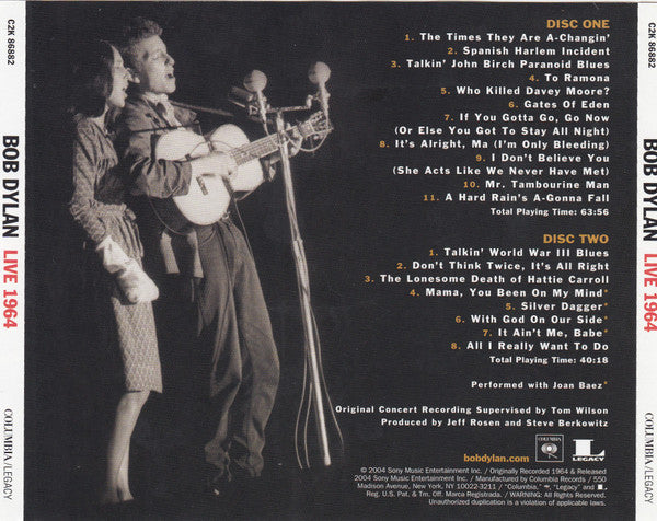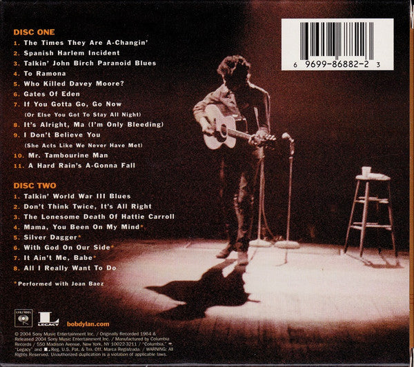 Recorded October 31, 1964 at Philharmonic Hall, New York City. Mixed at Quad Studios, NYC. Mastered at Sterling Sound, NYC. © 2004 Sony Music Entertainment Inc. Originally Recorded 1964 & Released 2004 Sony Music Entertainment Inc. Issued in jewel box with 54-page booklet in slipcase. Hype sticker affixed to shrinkwrap, with catalog number K 86882-S1: Bob Dylan's Historic "Halloween Concert" Features The Entire 19 Song Concert - Released For The First Time Ever! Plus 4 Duets With Joan Baez Mixed And Mastered For Phenomenal And Unprecedented Sound Deluxe Packaging Includes 56 Page Book With Rare Photos And Indepth Notes Title on jewel case spine: Live 1964