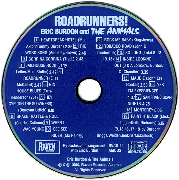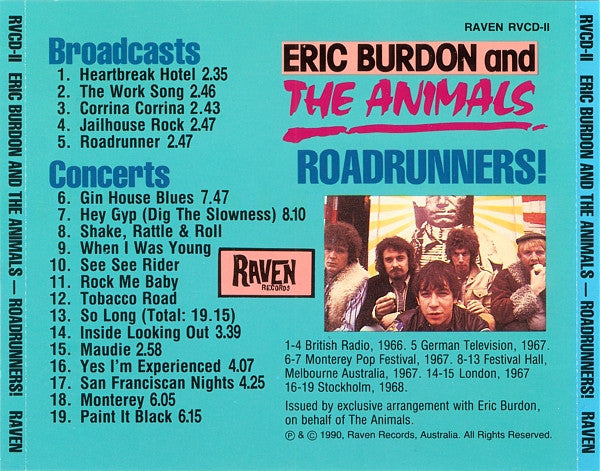 Rare Live And Studio Recordings From Melbourne, Monterey, London, Stockholm 1966-1968. 1-4 British Radio, 1966. 5 German Television, 1967. 6-7 Monterey Pop Festival, 1967. 8-13 Festival Hall, Melbourne Australia, 1967. 14-15 London, 1967 16-19 Stockholm, 1968. Issued by exclusive arrangement with Eric Burdon, on behalf of The Animals. ℗ & © 1990, Raven Records, Australia. The total duration of the tracks 8 to 13 is given as 19:15.