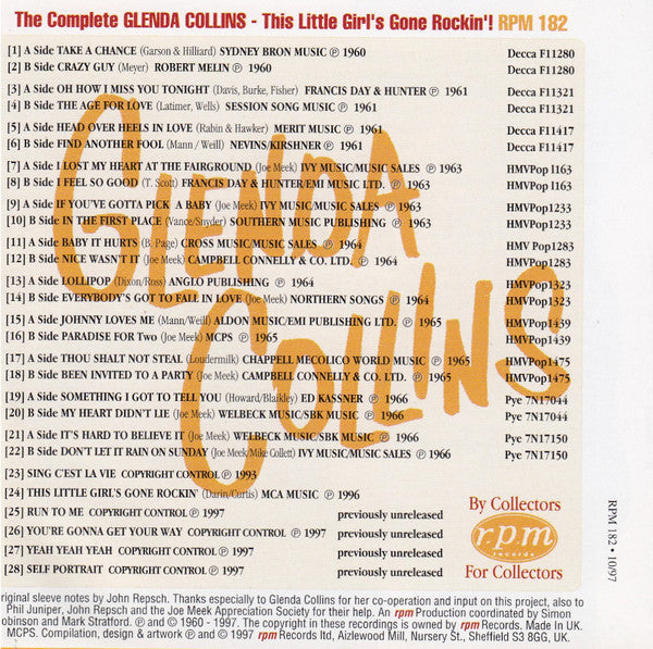 tr. 25 - 28: previously unreleased tr. 15 listed as "Johnny Love Me" tr. 29 is not listed, it's "Sing C'est La Vie" without the second (male) singer french parts