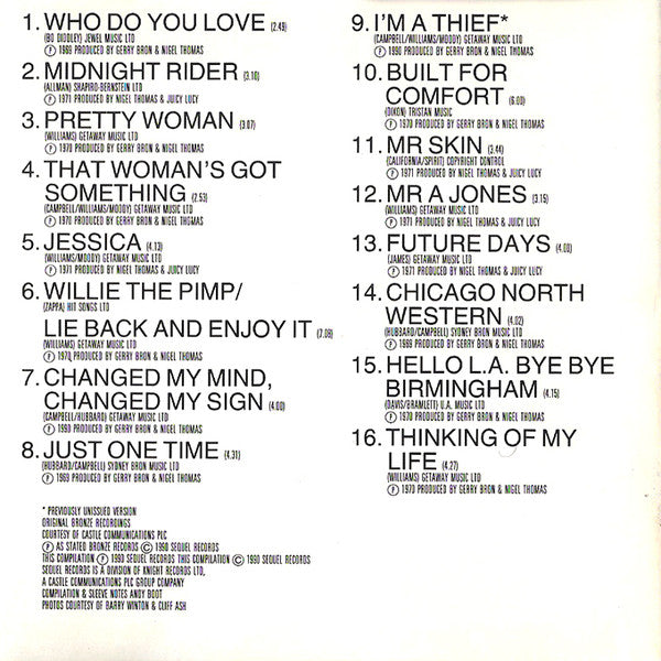 ORIGINAL BRONZE RECORDINGS COURTESY OF CASTLE COMMUNICATIONS PLC ℗ AS STATED BRONZE RECORDS © 1990 SEQUEL RECORDS THIS COMPILATION ℗ 1990 SEQUEL RECORDS THIS COMPILATION © 1990 SEQUEL RECORDS SEQUEL RECORDS IS A DIVISION OF KNIGHT RECORDS LTD A CASTLE COMMUNICATIONS PLC GROUP COMPANY Tracks 1 / 8 / 14 from [m29011 (1969) Tracks 3 / 4 / 6 / 7 / 10 / 15 / 16 from [m129388 (1970) Tracks 2 / 5 / 11 / 12 / 13 from [m29008 (1971) Track 9 originally released as single B-side in 1970 (previously inissued version)