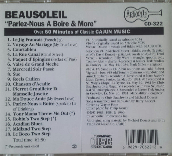 Includes transcriptions and translations of the songs #1-13 originally issued as Arhoolie 5034 #16-18 originally issued on Arhoolie 5025 Selections #1-15: Recorded at Master Trak Studios in Crowley, La. May 14, 1984. #16 recorded at Marc Savoy's Music Center, Eunice, La. May 20, 1981 #17 recorded at St. Mary's Chapel, Lafayette, La. May 19, 1981 by Chris Strachwitz on a Nagra IV-S recorder with two Neumann KM 861 microphones #18 recorded at Master Trak Studios in Crowley, La. May 26, 1981 ©&℗ 1981, 1984 & 1990 by Arhoolie Productions Inc. All original song material by Michael Doucet and © by Tradition Music Co. (BMI) Inserts: Printed in Canada Catalog number variations: CD-322 on the cover, back, booklet and CD CD 322 on the spine Album title variations: Parlez-Nous A Boire & More on the spine, back, booklet and CD Parlez-Nous A Boire on the cover Courtableau is misspelled as "Courtableu" on the back and CD; also the booklet has accents on some titles while the back cover doesn't (Paquet D'Épingles, Valse De Grand Mèche, Parlez-Nous À Boire)