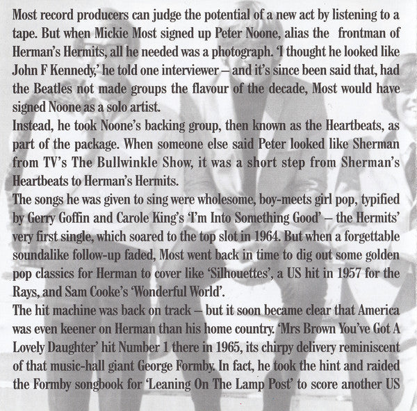 "THE CONCERT COLLECTION" - all songs are live versions with a later line-up. Booklet mentions (post) "...a spell surfing the new-wave with the Tremblers, he's since recruited his own Hermits to revisit the glory days". Total running time: 49 minutes Track 13 titled "A Little Bit Better" on the release. Track 16 titled "Mrs Brown You've Got A Lovely Daughter" on the release. Track 17 titled "I'm Henry The VIII, I Am" on the release. Track 18 titled "A Kind Of Hush" on the release. This compilation ℗ & © Prism Leisure 1997. Issued in a standard black tray jewel case with a 4-page booklet.