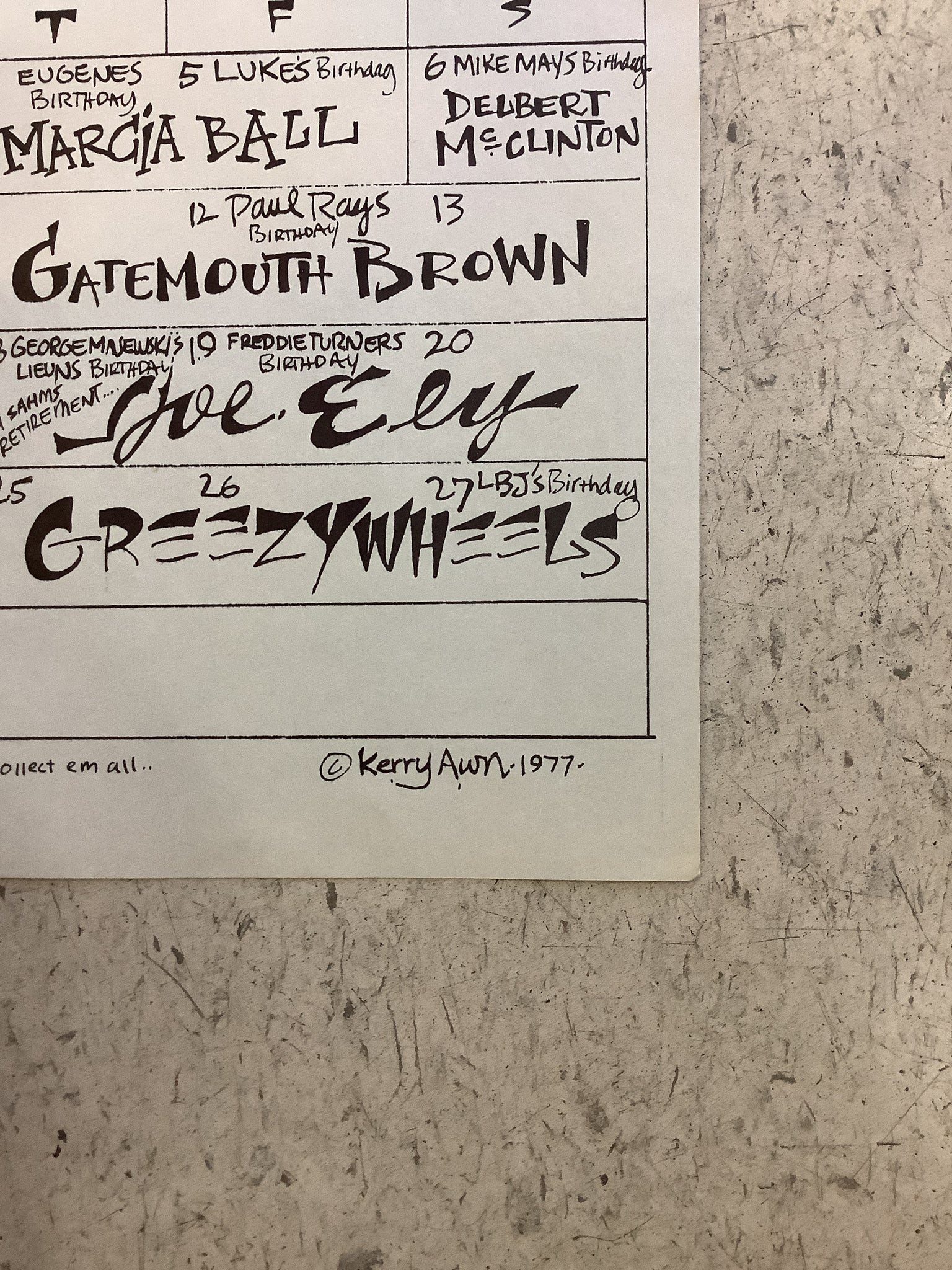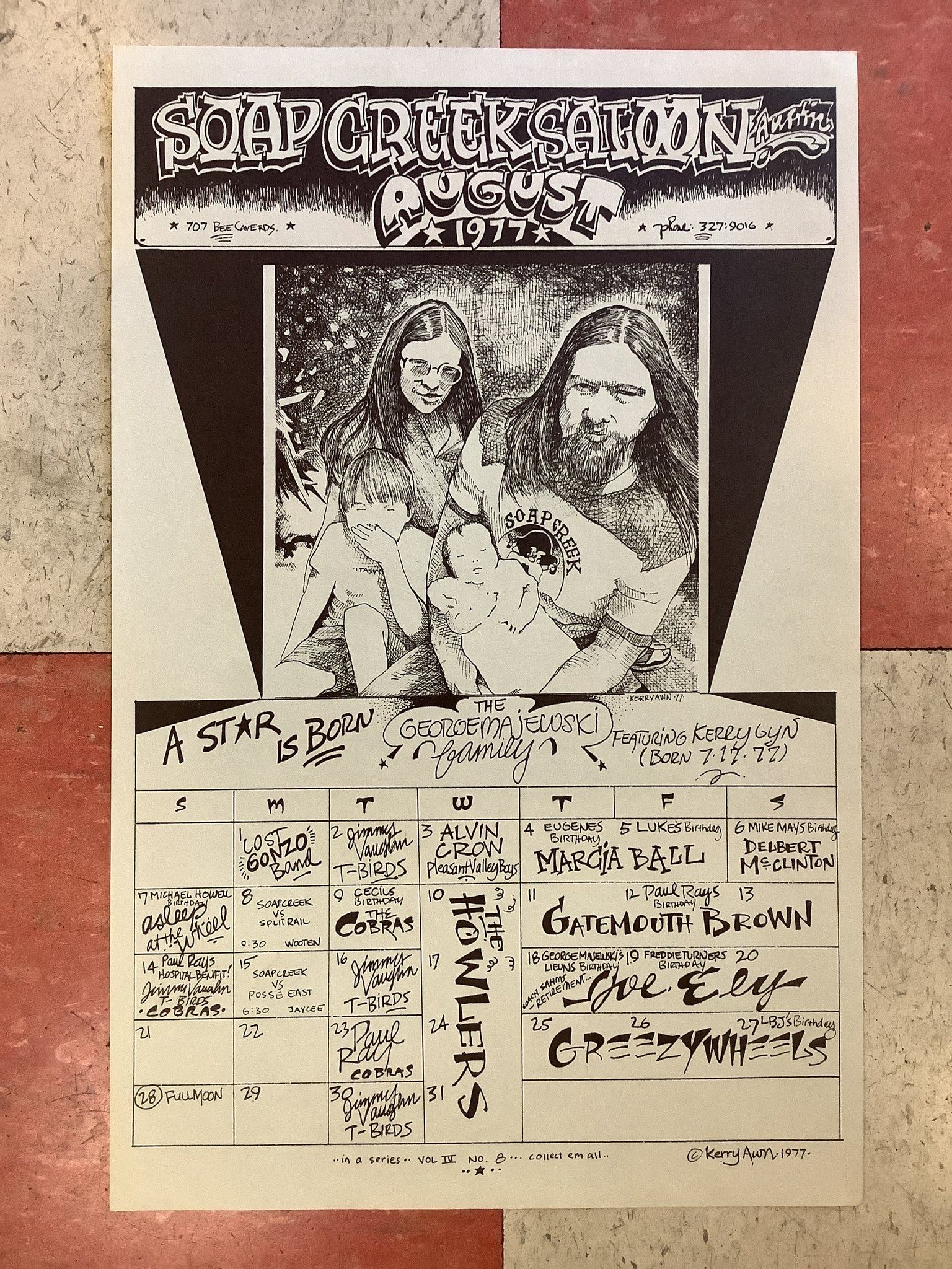 Vintage Soap Creek Saloon poster designed by Kerry Awn. Promoting shows with Paul Ray and The Cobras (with Stevie Ray Vaughan), Clarence Gatemouth Brown, Lost Gonzo Band, Asleep at the Wheel, Joe Ely, Jimmie Vaughan and The Fabulous Thunderbirds, and more!