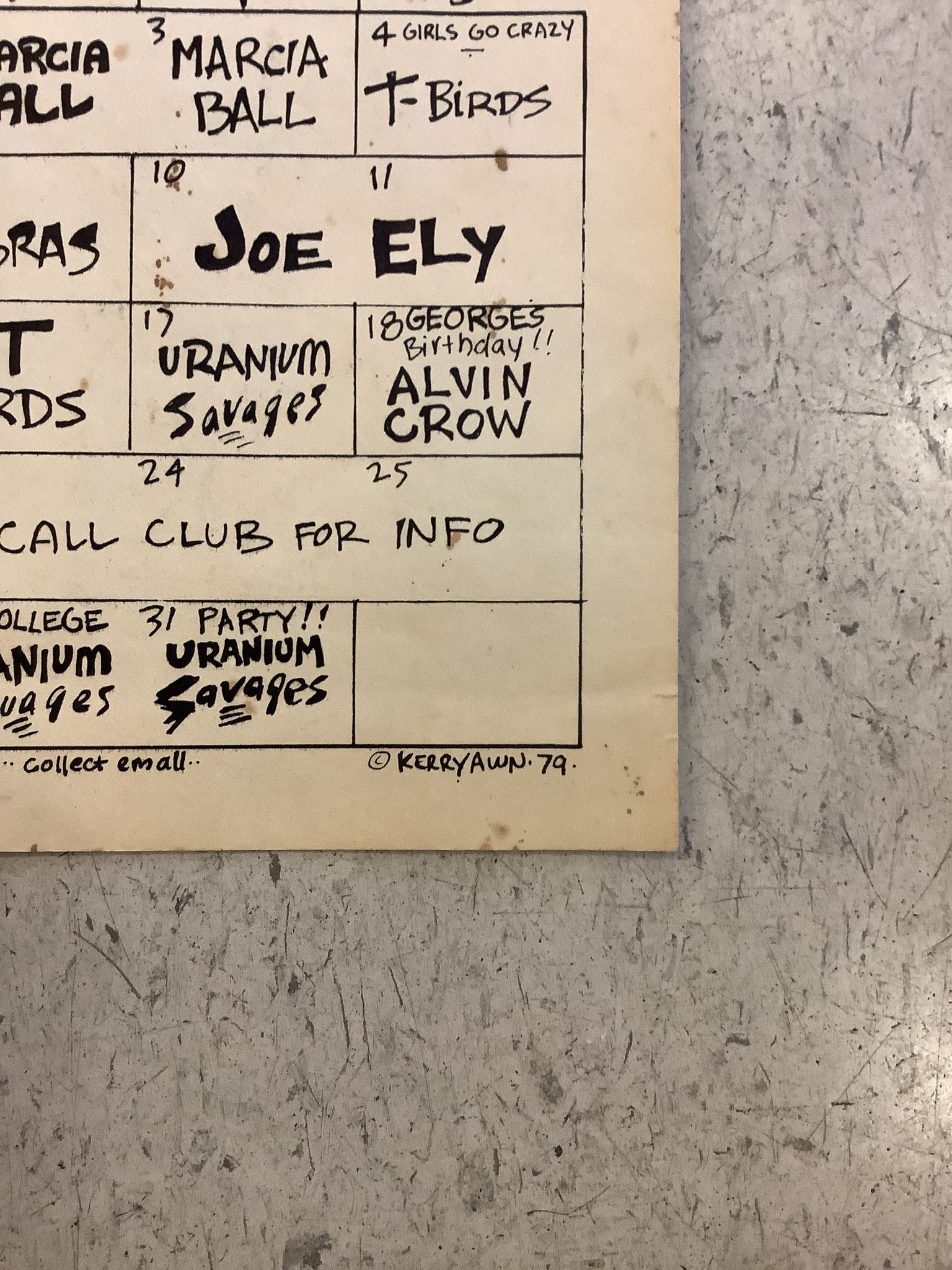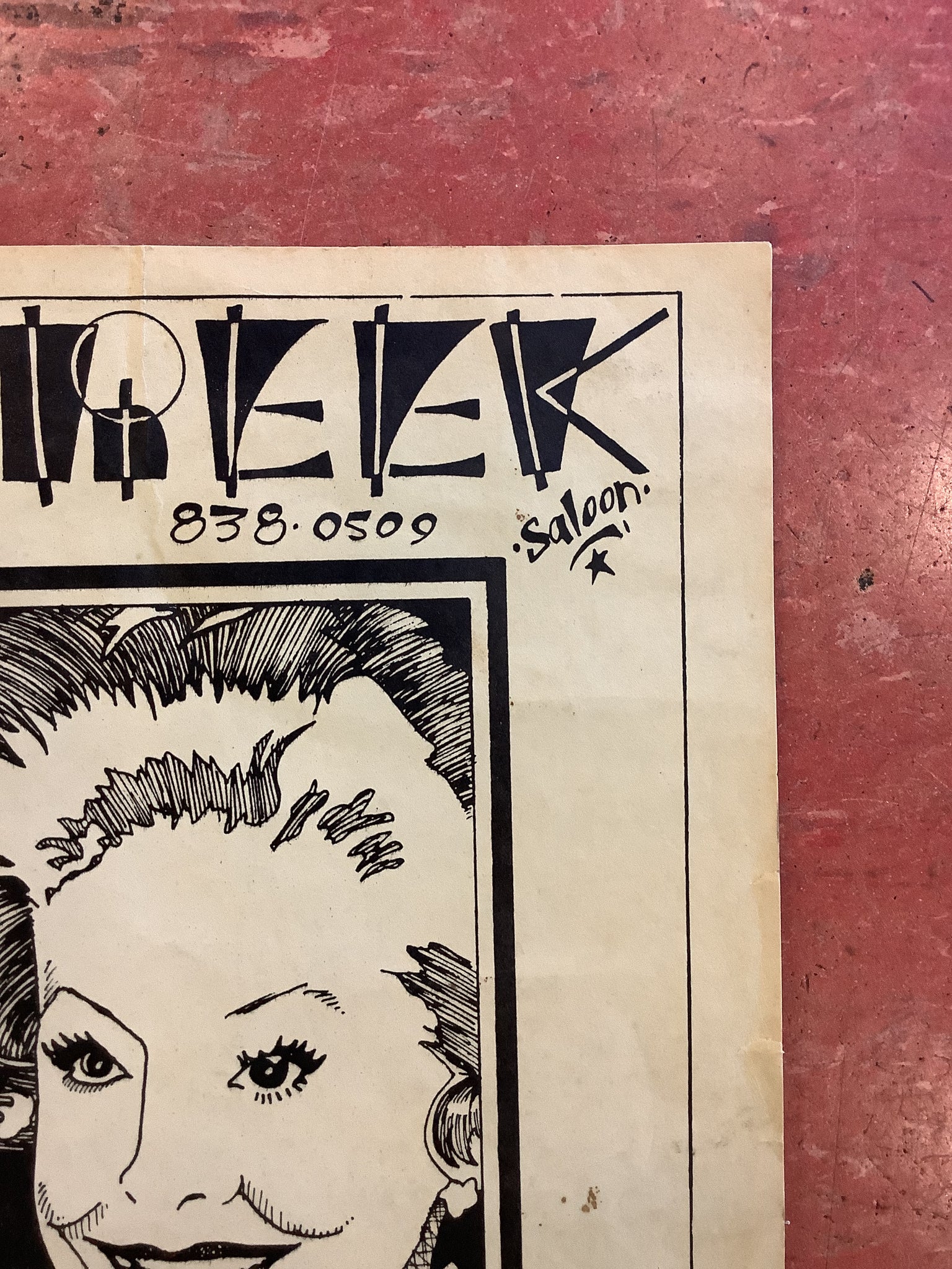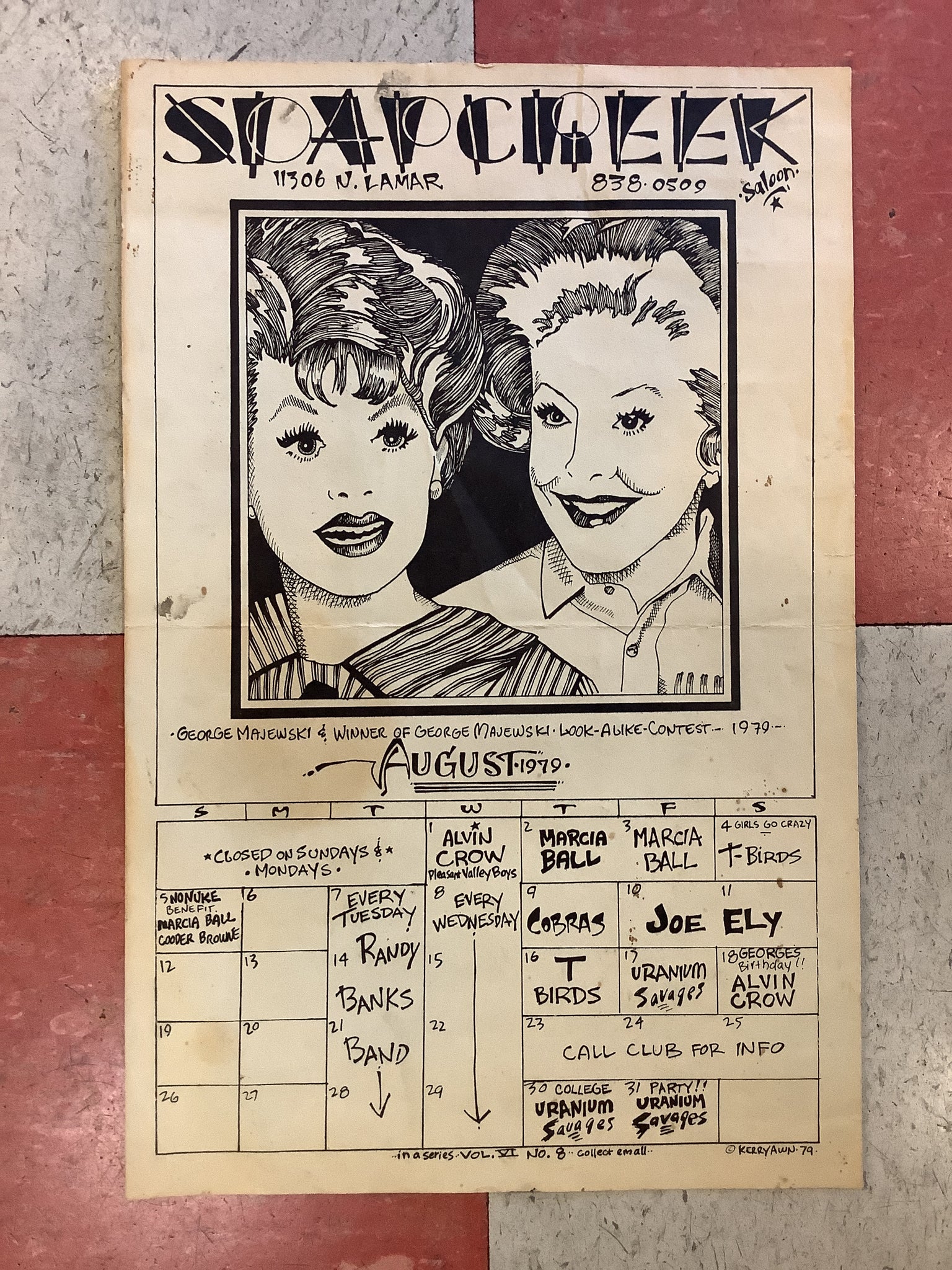 Vintage Soap Creek Saloon poster designed by Kerry Awn. Promoting shows with Marcia Ball, Alvin Crow, Randy Banks Band, Cobras, Joe Ely, T-Birds, Uranium Savages, and more! August 1979.