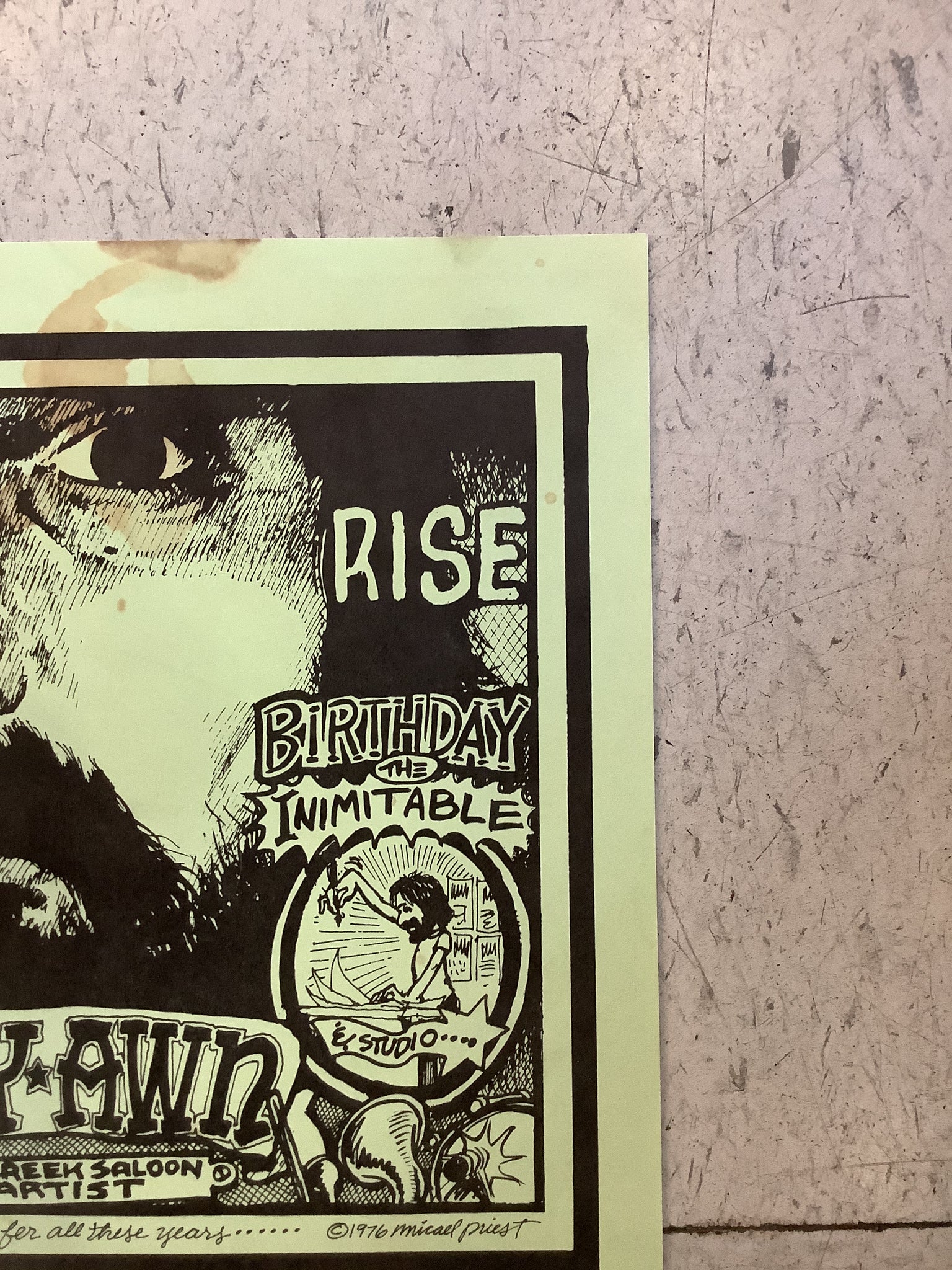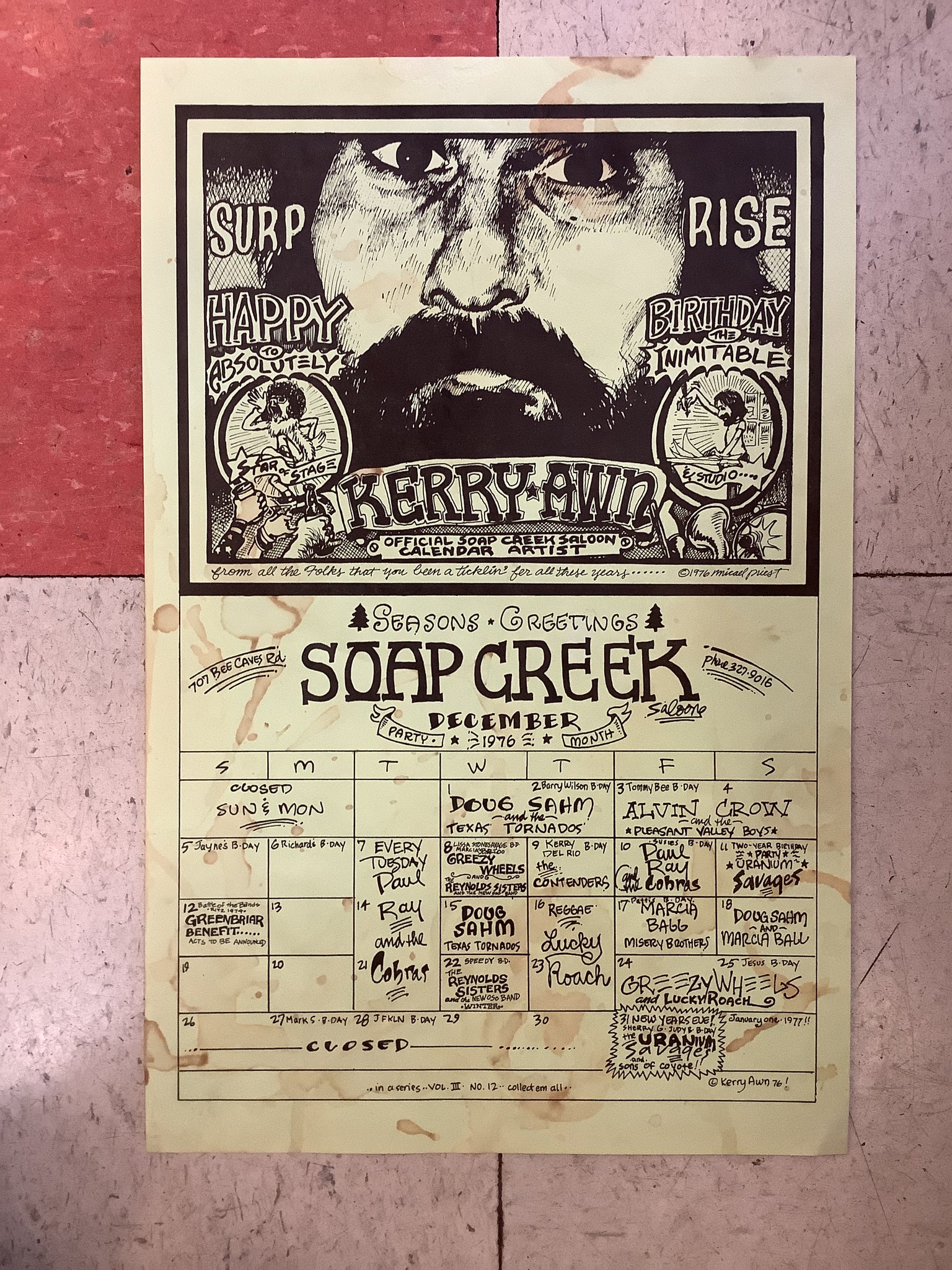 Vintage Soap Creek Saloon poster designed by Kerry Awn and Micael Priest. Promoting shows with Doug Sahm and the Texas Tornados, Alvin Crow, Uranium Savages, Greezy Wheels, and more! December 1976.