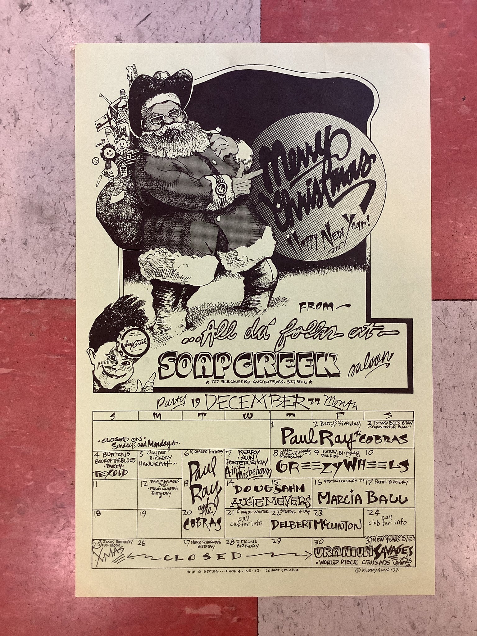 Vintage Soap Creek Saloon poster designed by Kerry Awn. Promoting shows with Paul Ray and The Cobras, Doug Sahm and Augie Meyers, Delbert McClinton, Marcia Ball, Greezy Wheels, Uranium Savages, and more!