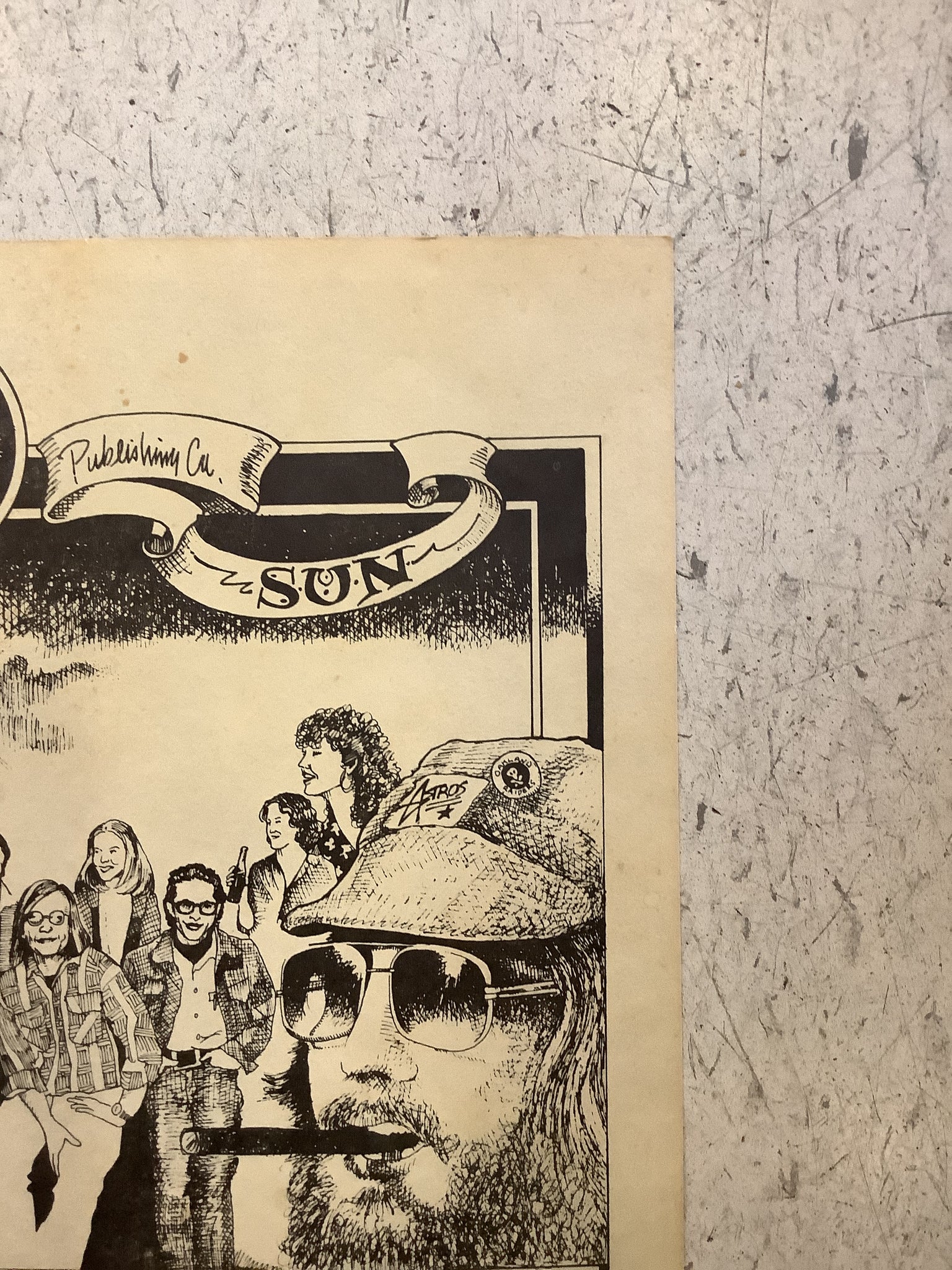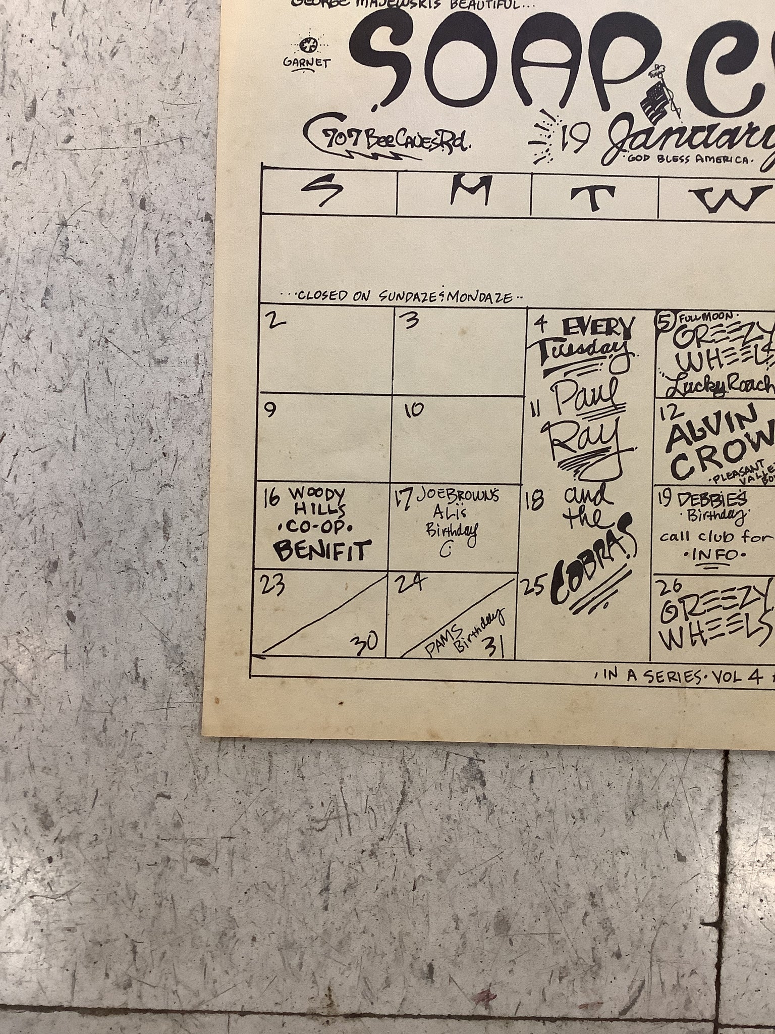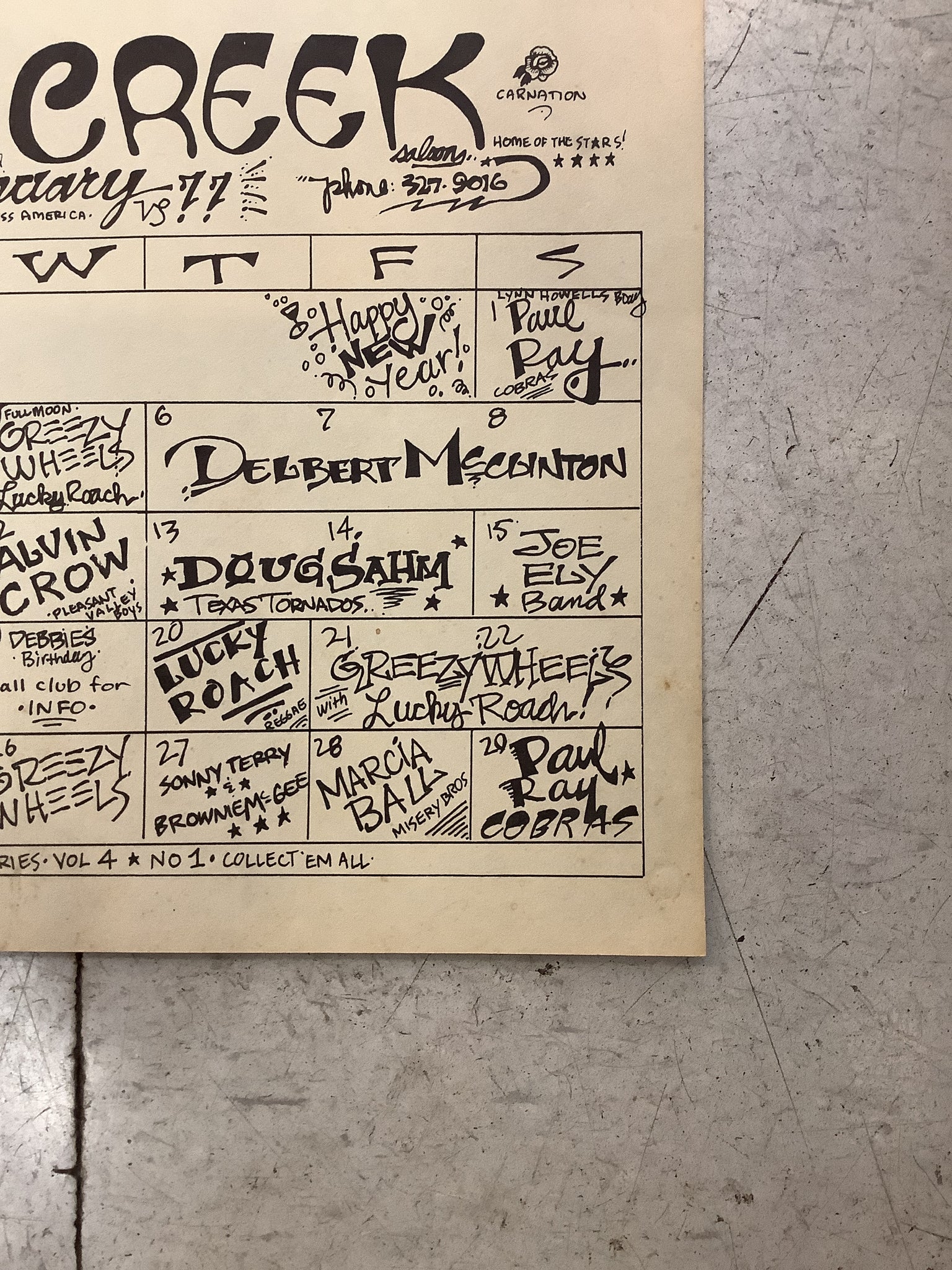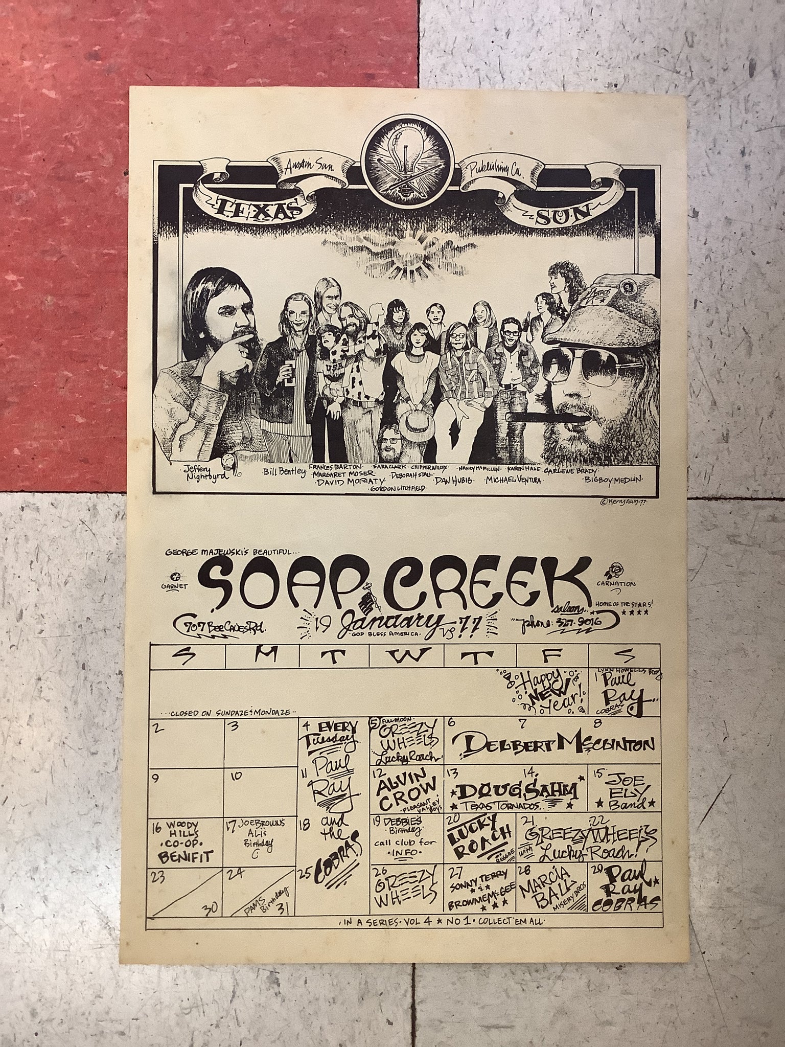 Vintage Soap Creek Saloon poster designed by Kerry Awn. Promoting shows with Paul Ray and The Cobras, Delbert McClinton, Joe Ely, Doug Sahm/Texas Tornados, Marcia Ball, and more! January 1977.