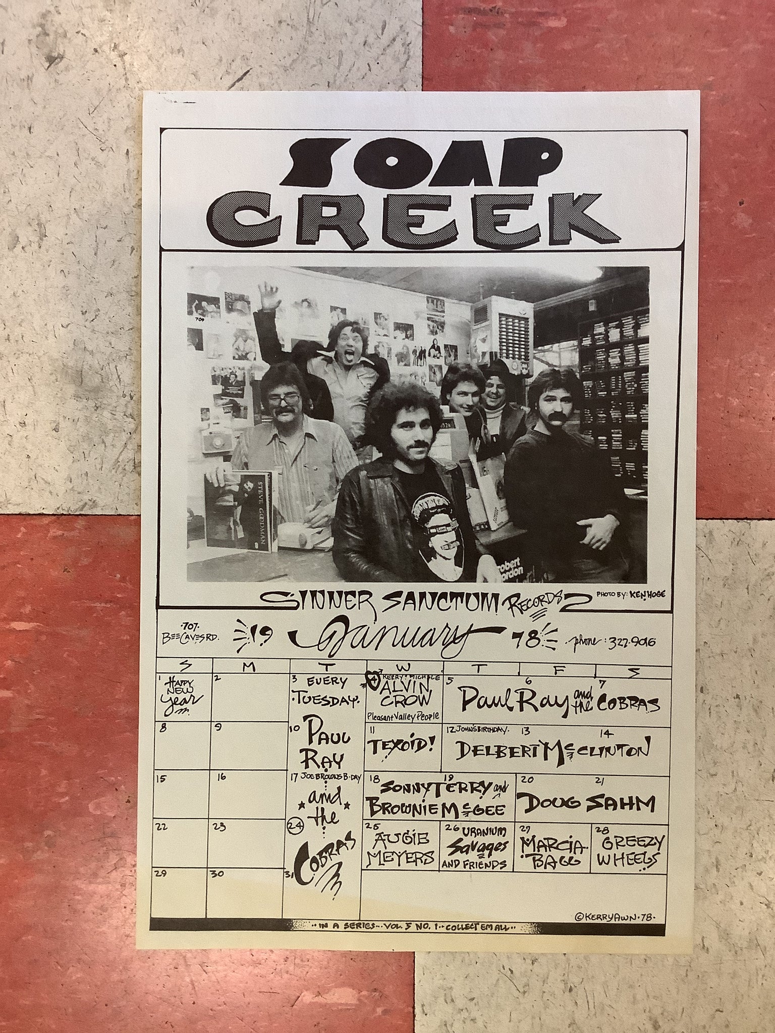 Vintage Soap Creek Saloon designed by Kerry Awn. Promoting shows with Paul Ray and The Cobras, Texoid, Delbert McClinton, Doug Sahm, Augie Meyers, Alvin Crow, Uranium Savages, Marcia Ball, and more! Photo by Ken Hoge.