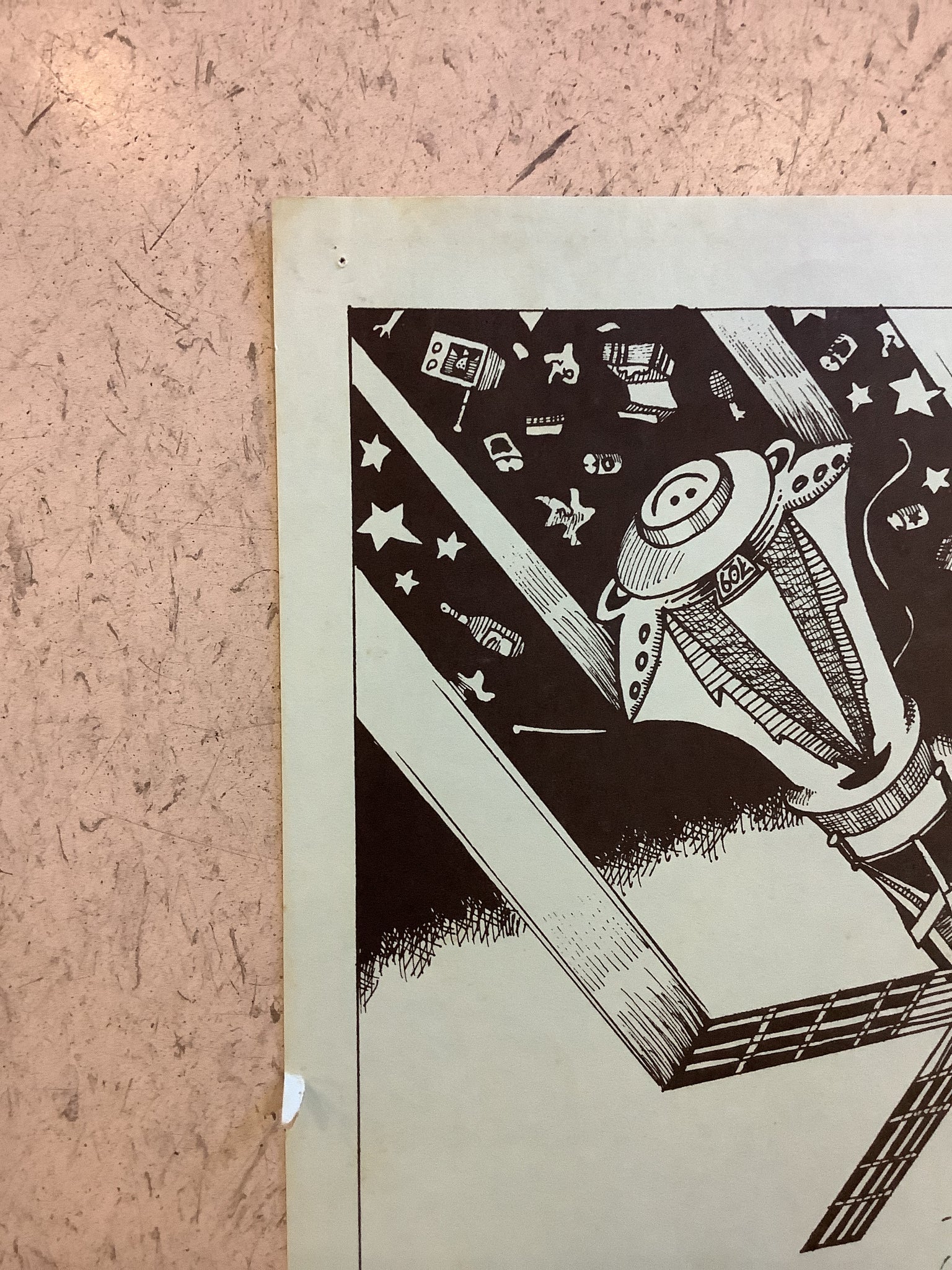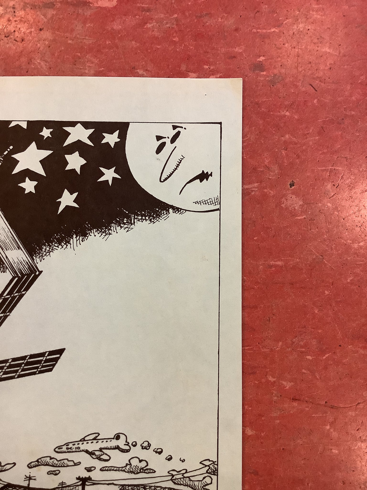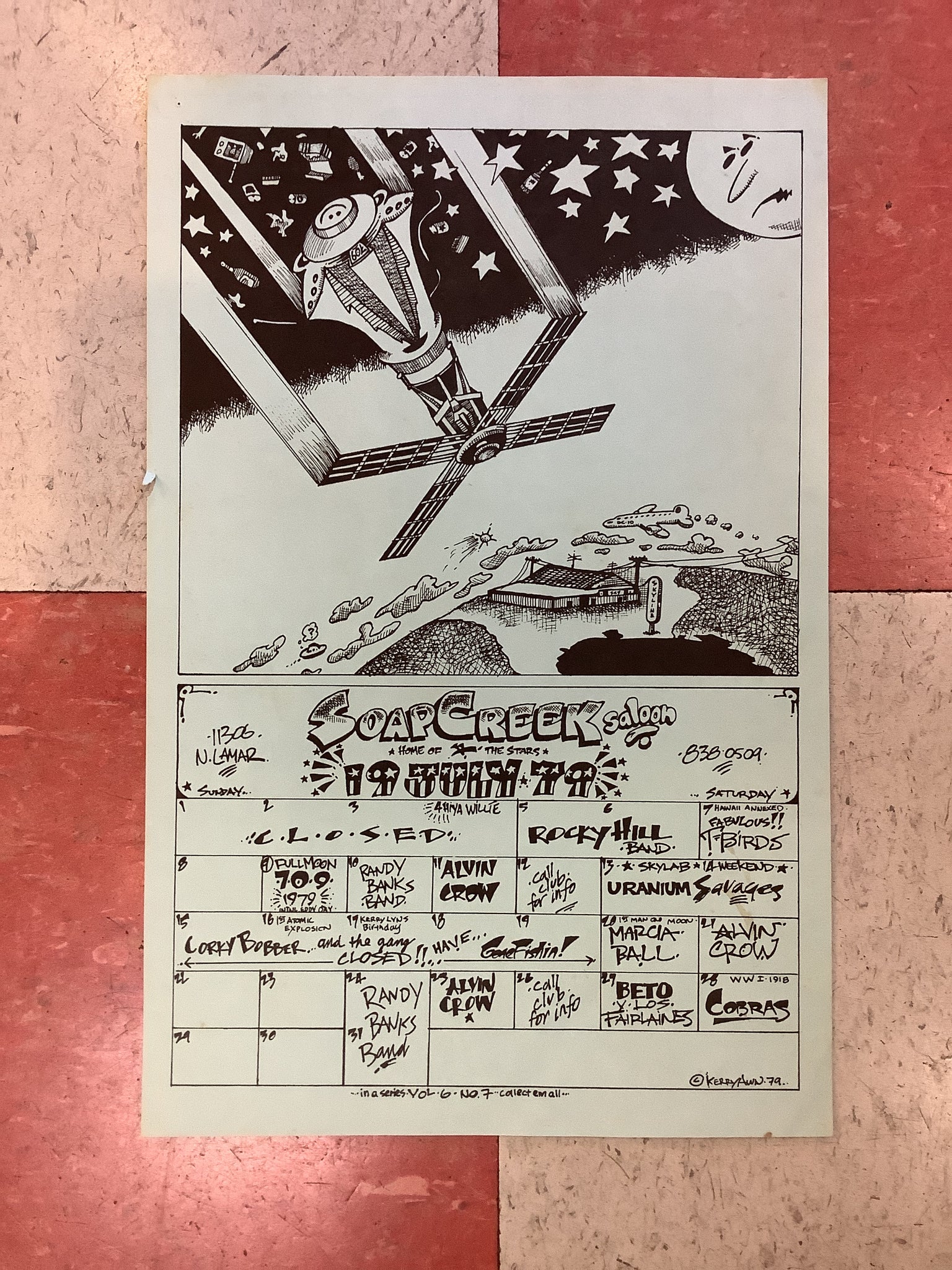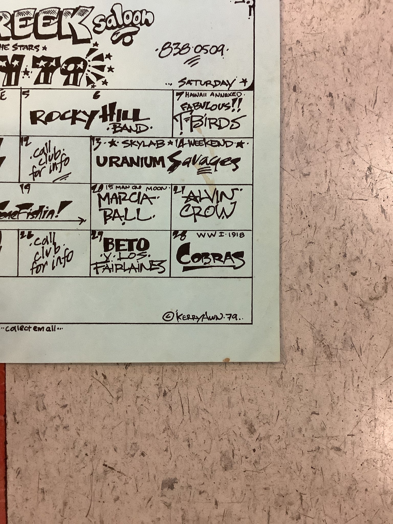 Vintage Soap Creek Saloon poster designed by Kerry Awn. Promoting shows with The Fabulous Thunderbirds, Uranium Savages, Alvin Crow, Marcia Ball, Beto Y Los Fairlaines. July 1979.