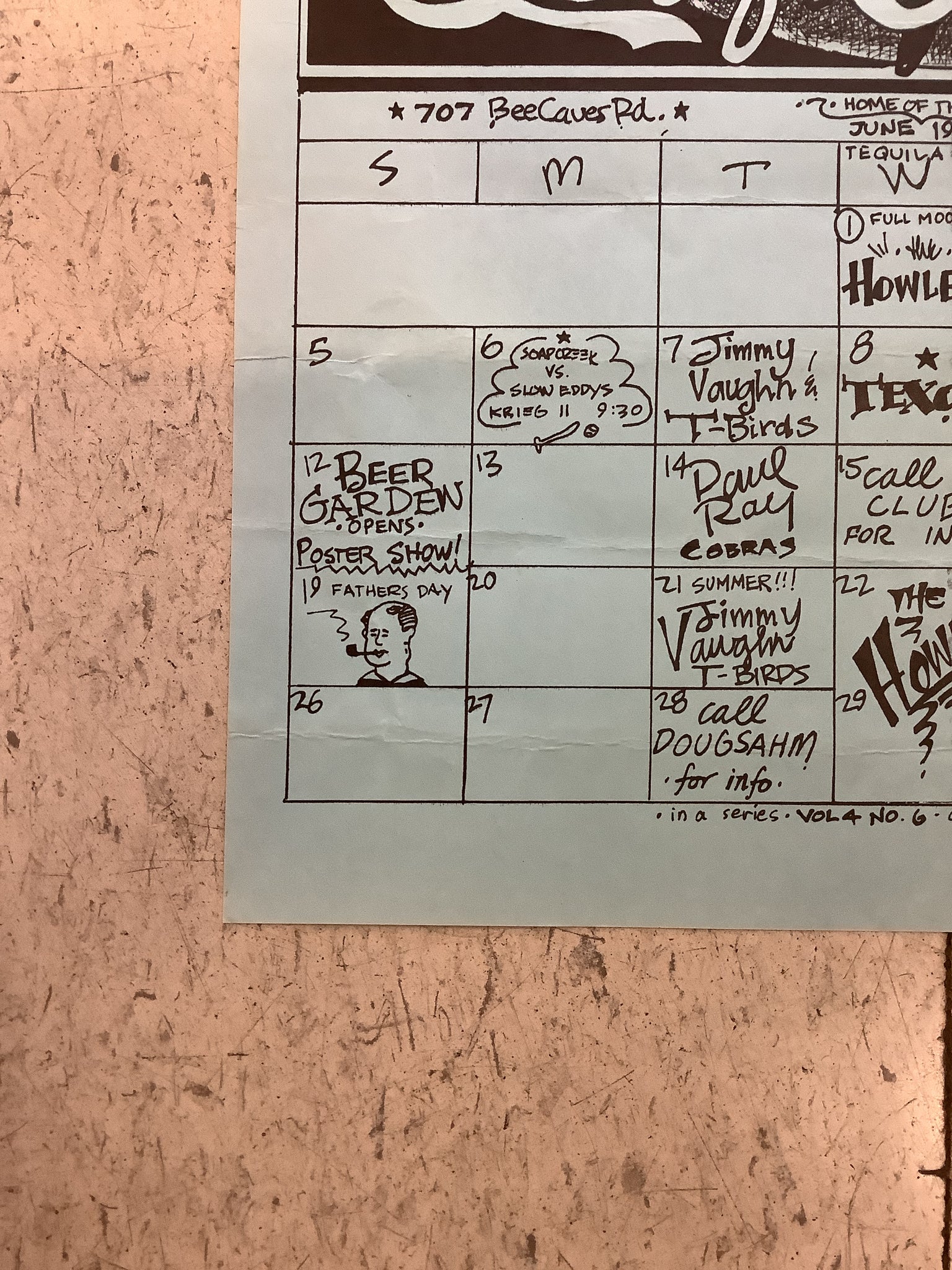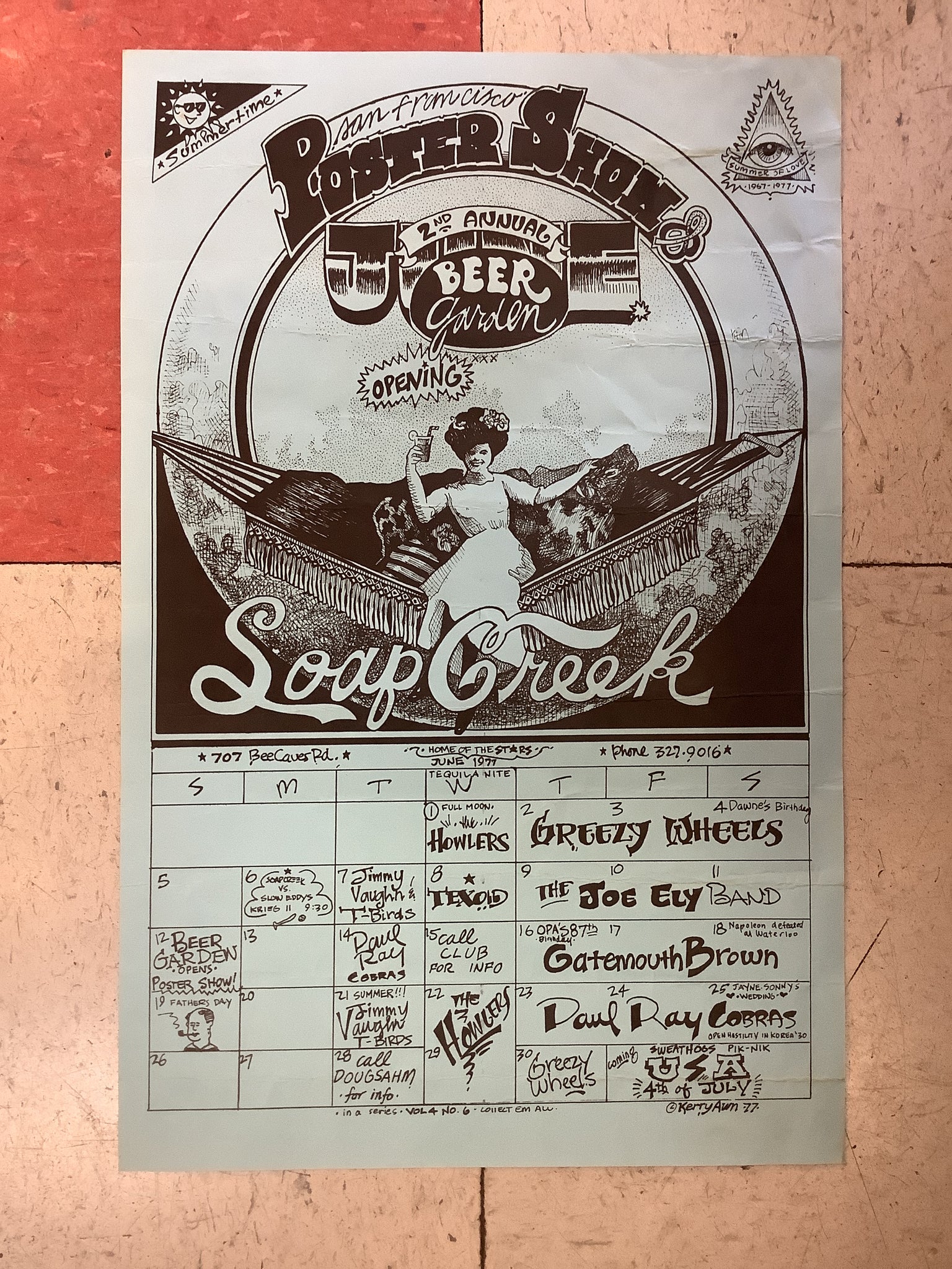 Vintage Soap Creek Saloon poster designed by Kerry Awn. Promoting shows with The Howlers, Jimmie Vaughan and The Fabluous Thunderbirds, Joe Ely, Clarence "Gatemouth" Brown, Paul Ray and The Cobras, and more! June 1977.