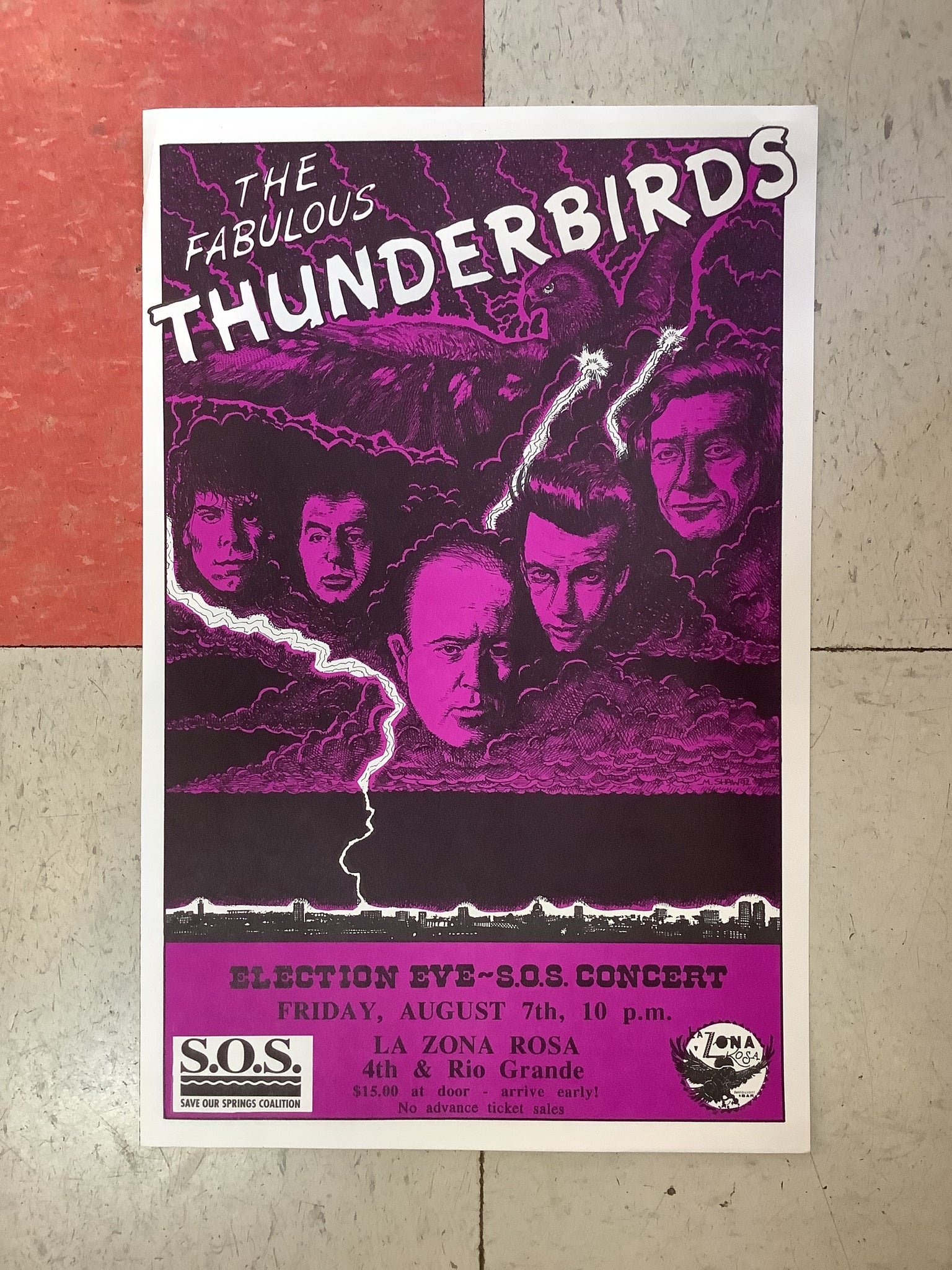 Vintage La Zona Rosa poster promoting Election-Eve/S.O.S. (save our springs coalition) concert with The Fabulous Thunderbirds. Designed by M. Shaw.